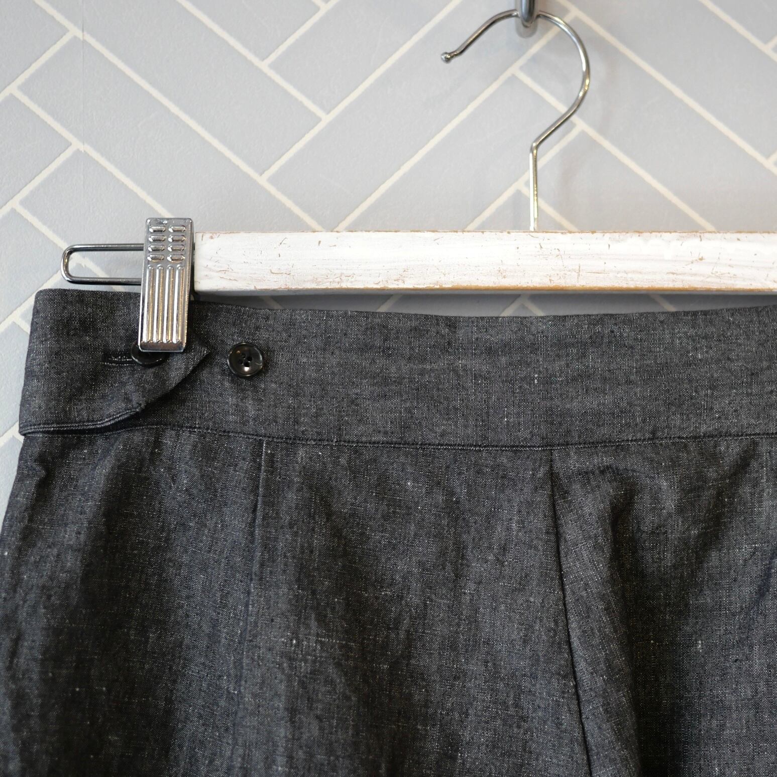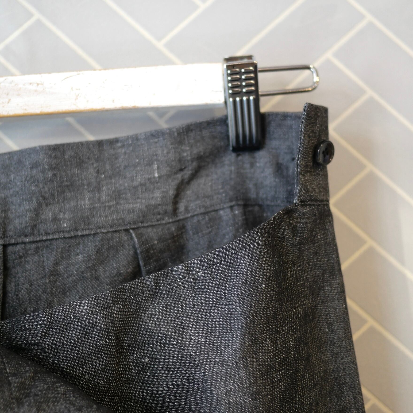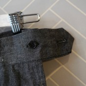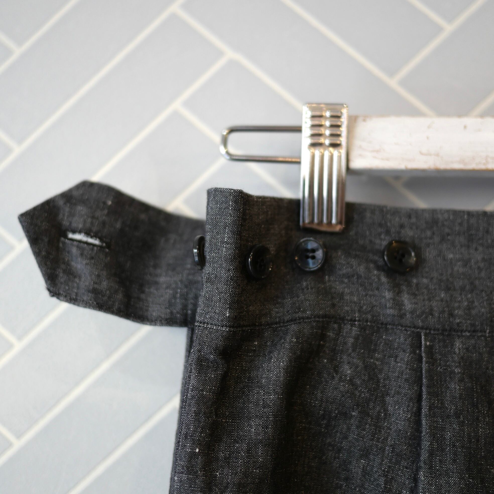 ウエストは左右にあるボタンを2箇所で留める型です。ボタン位置を変えることでウエストサイズを調節できます。