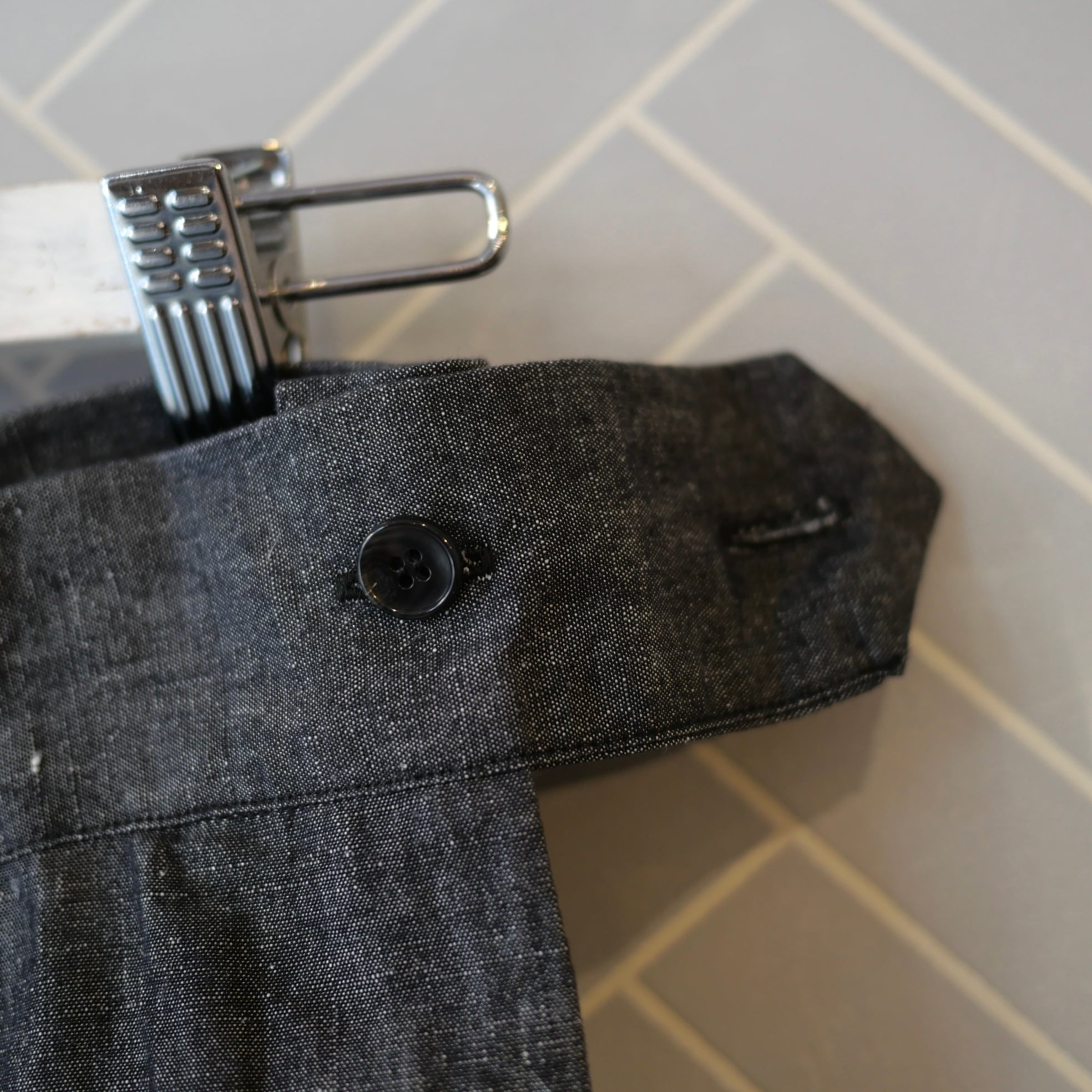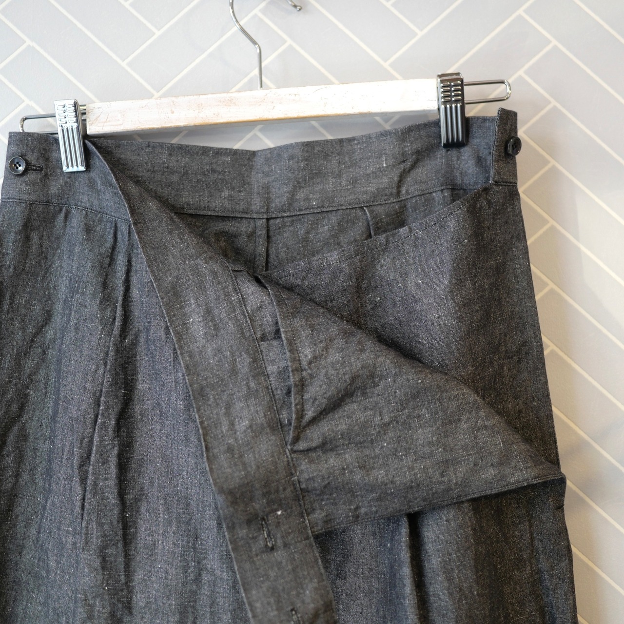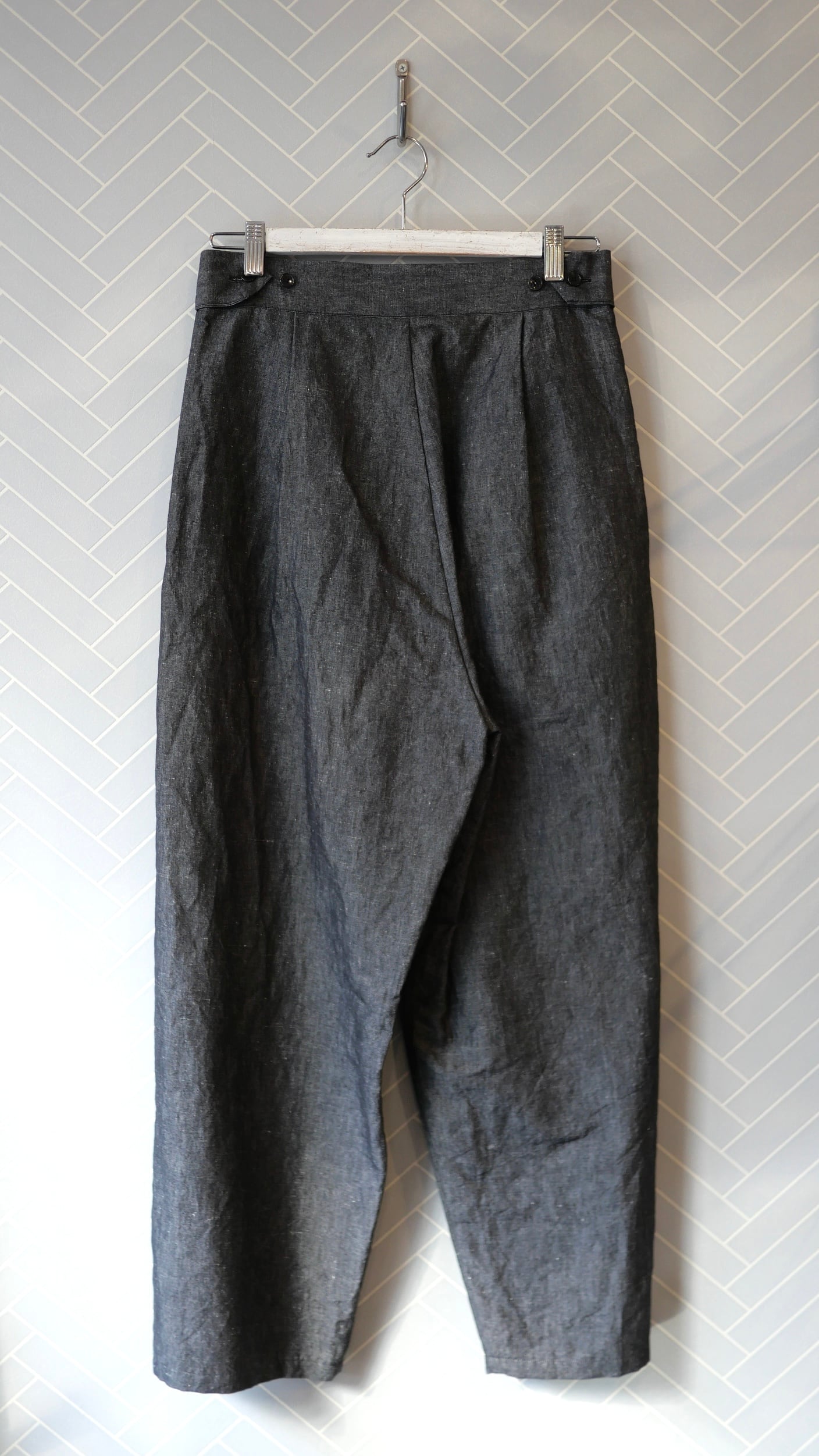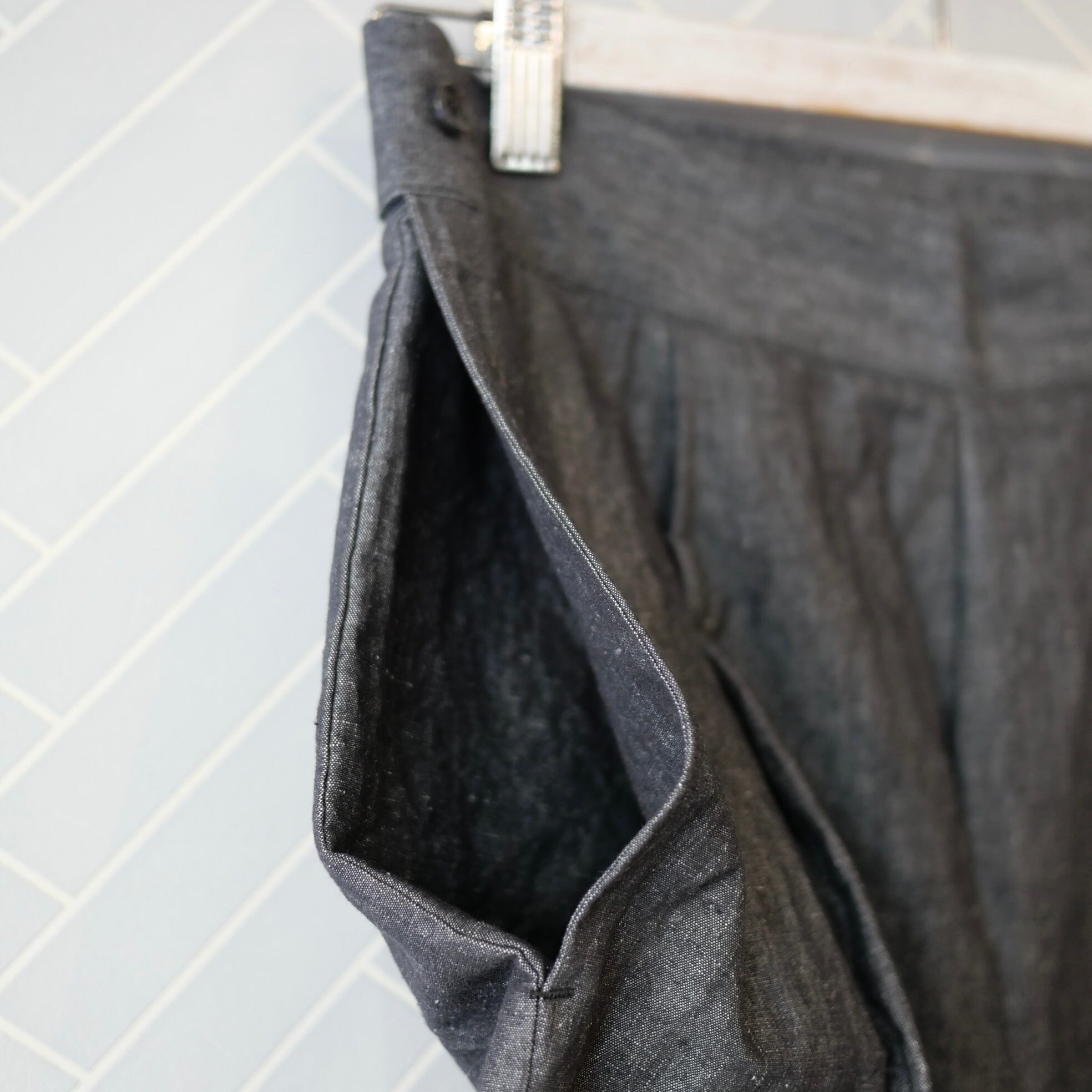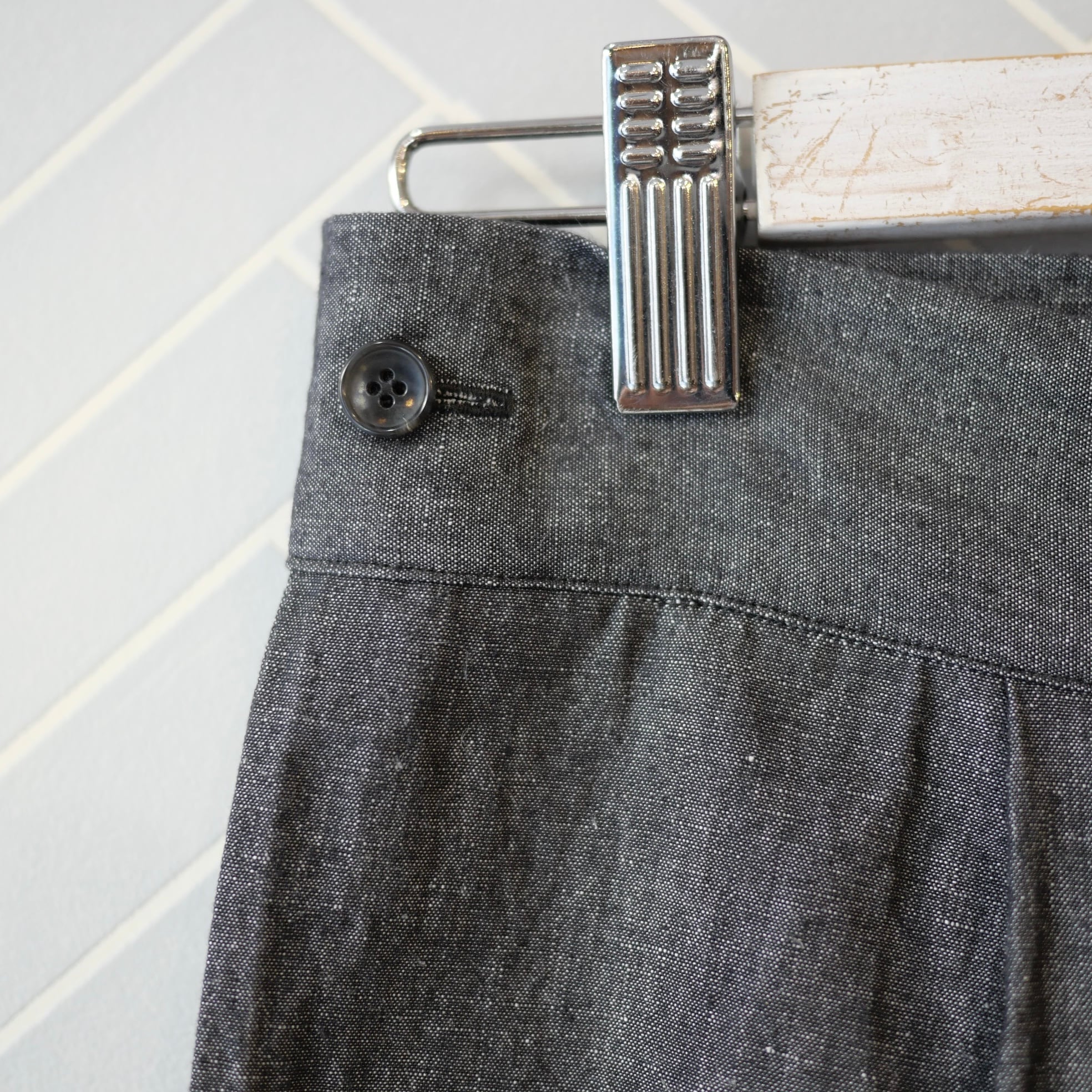 R&D.M.Co- シャンブレーコットン生地を使用したハイウエストパンツ。放湿性に優れたヘンプとコットンを使用した薄手のデニムパンツは、初夏から秋まで長い期間活躍します。