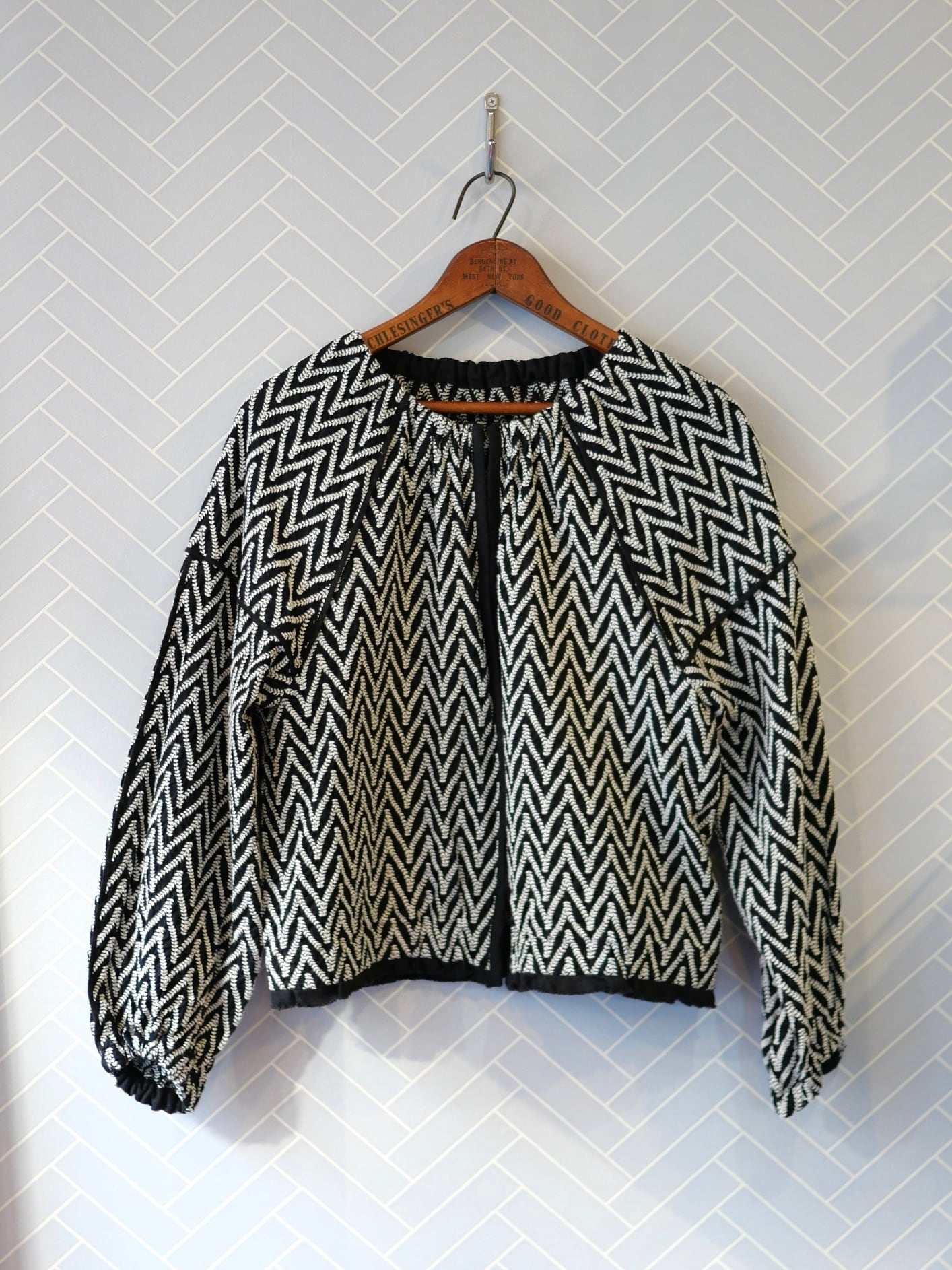リネンパイピングのフロントはスプリングホック仕様で、全部留めるとバルーンブラウスに。