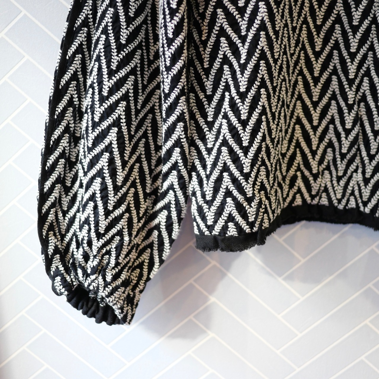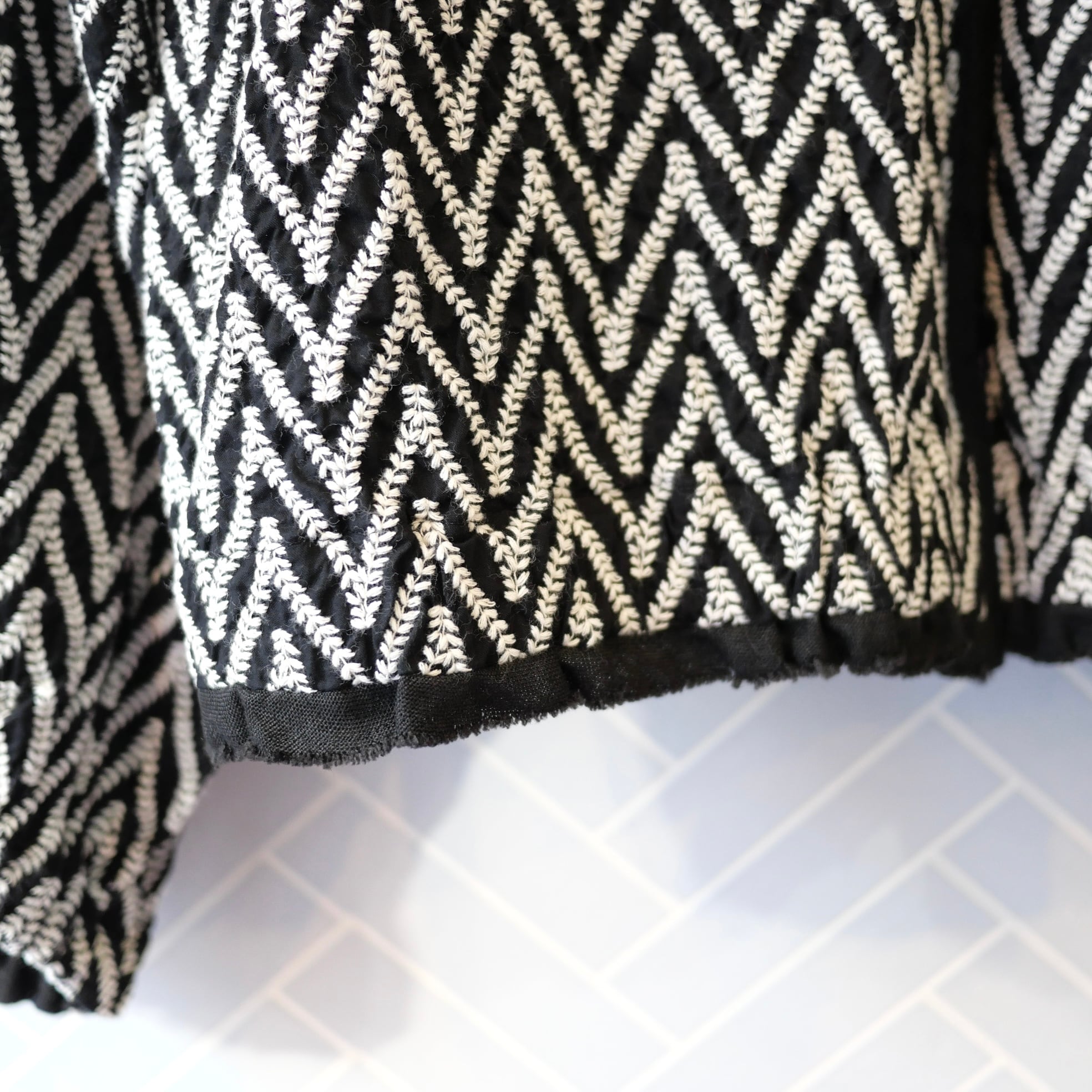 リーフデザインのジグザグ模様を刺した総刺繍の生地を使用しています。