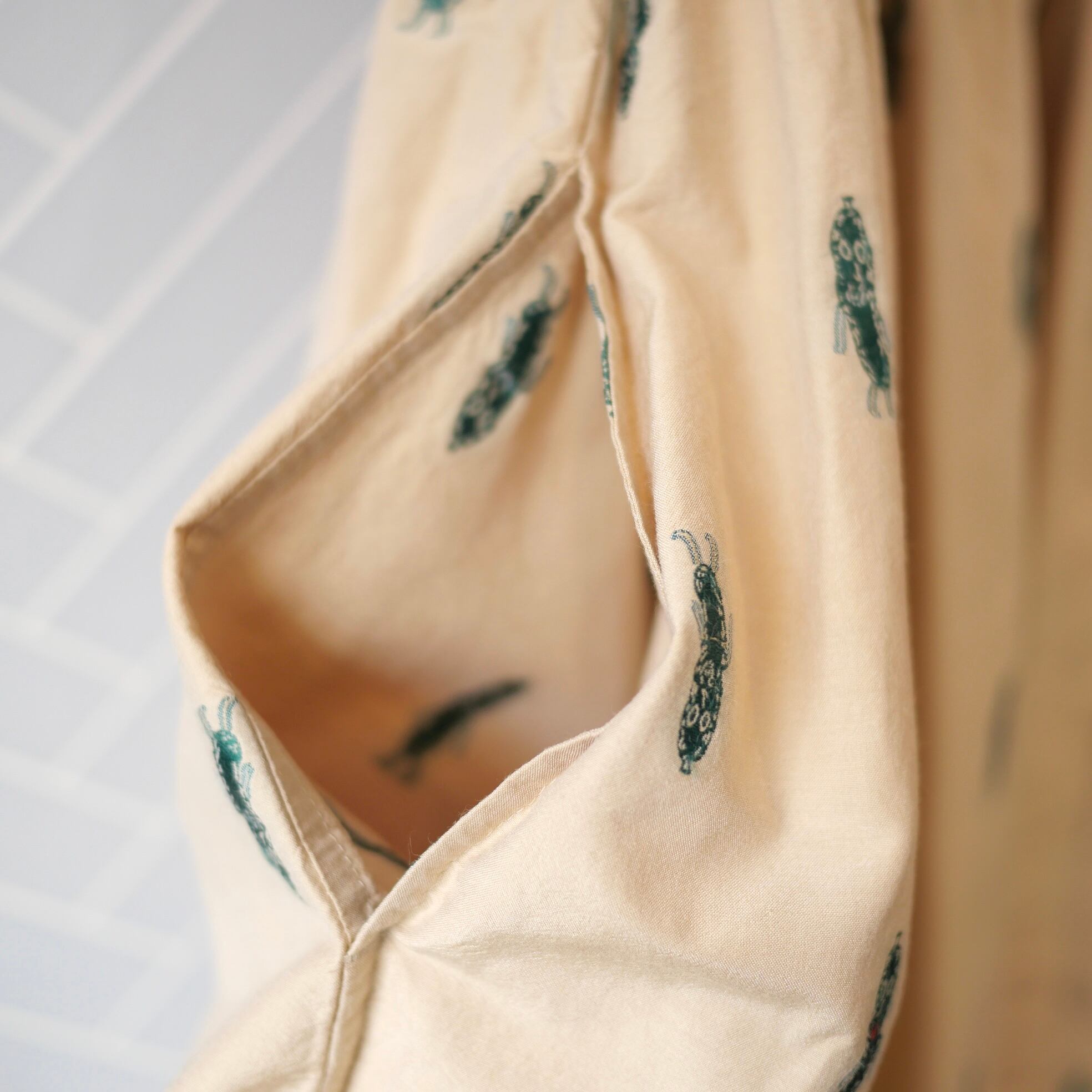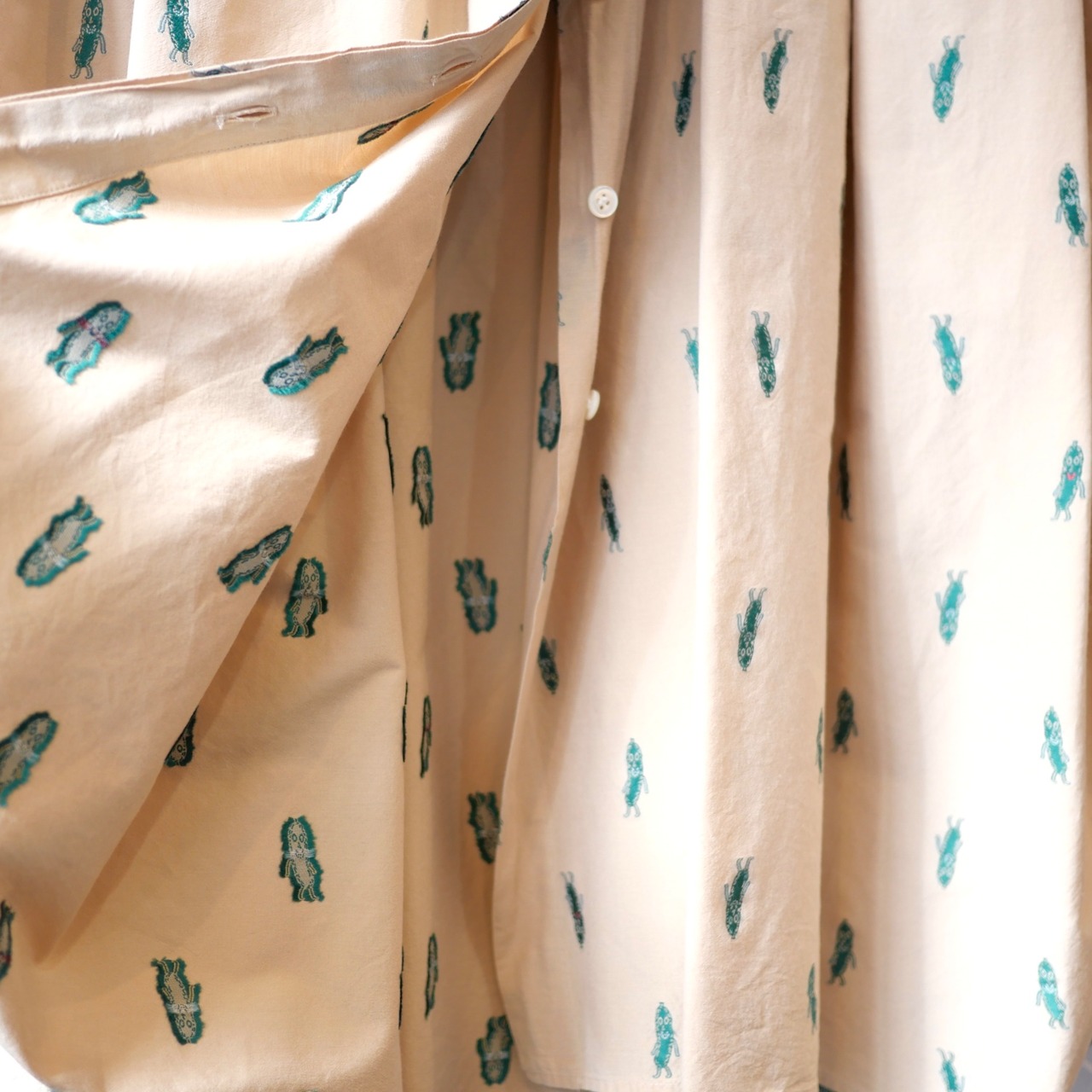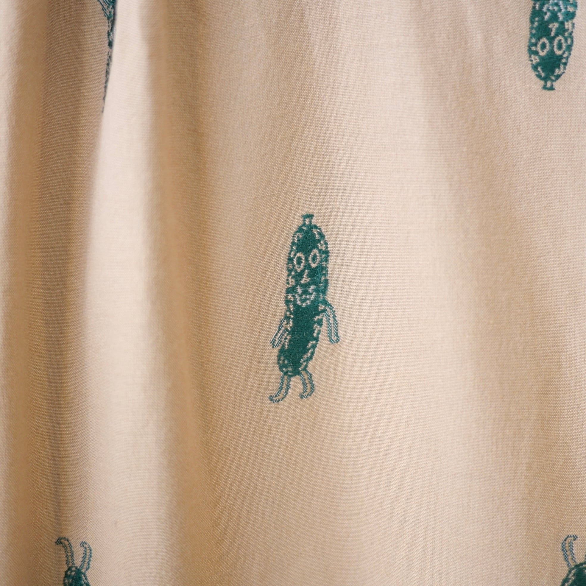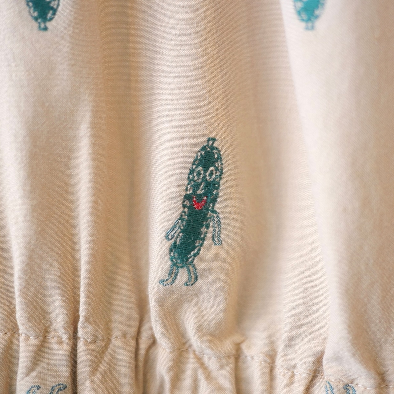 ピクルスくんの刺繍がかわいい遊び心のあるデザイン。両サイドのポケット下からコクーンの形になるシルエットです。