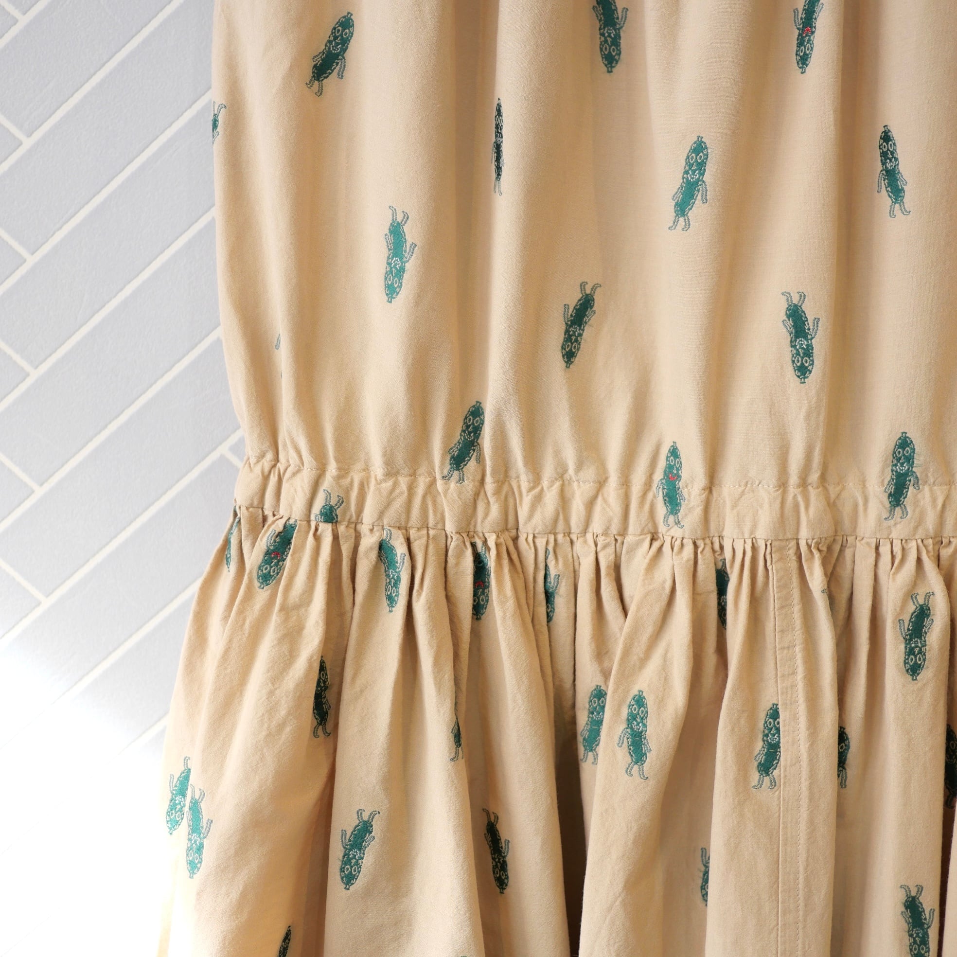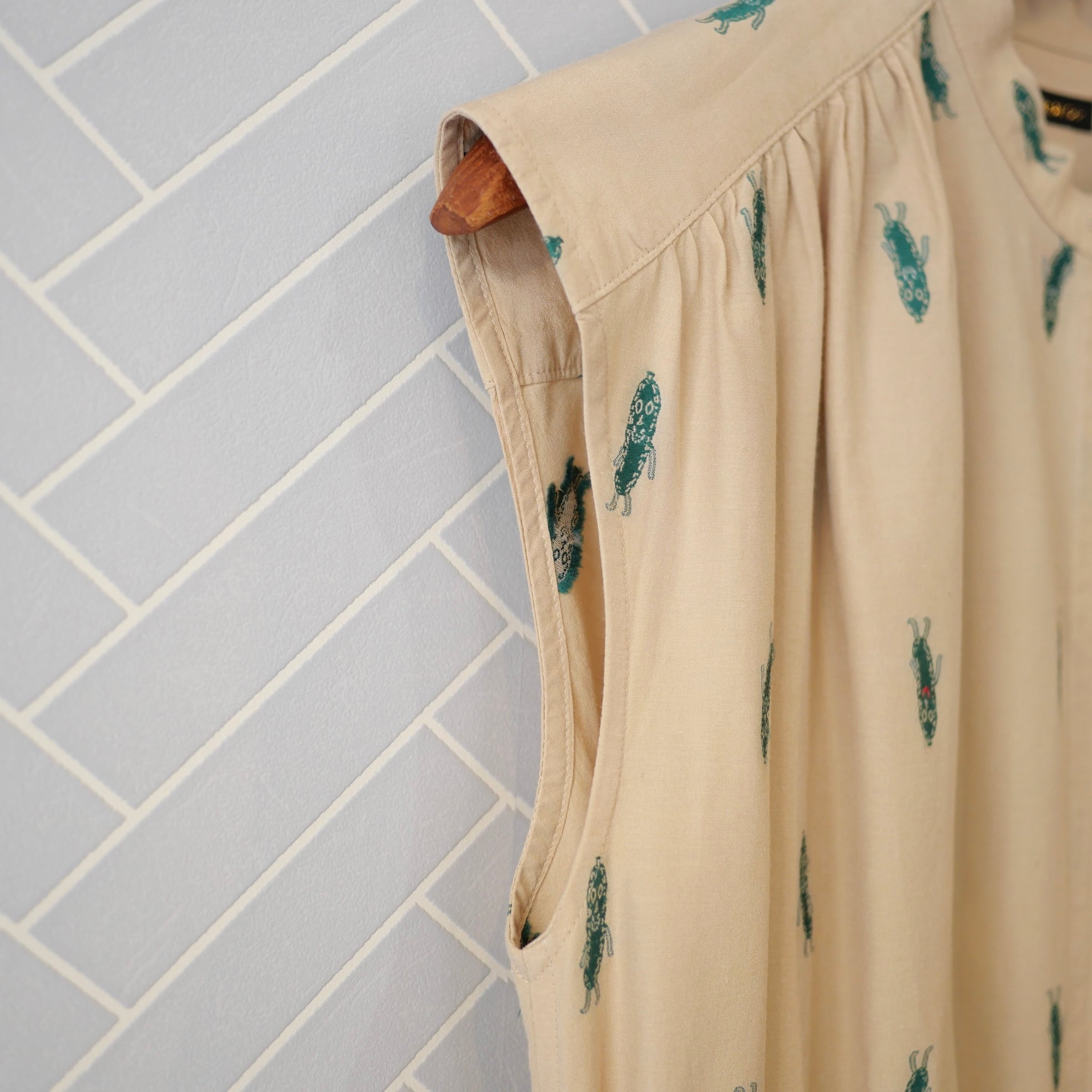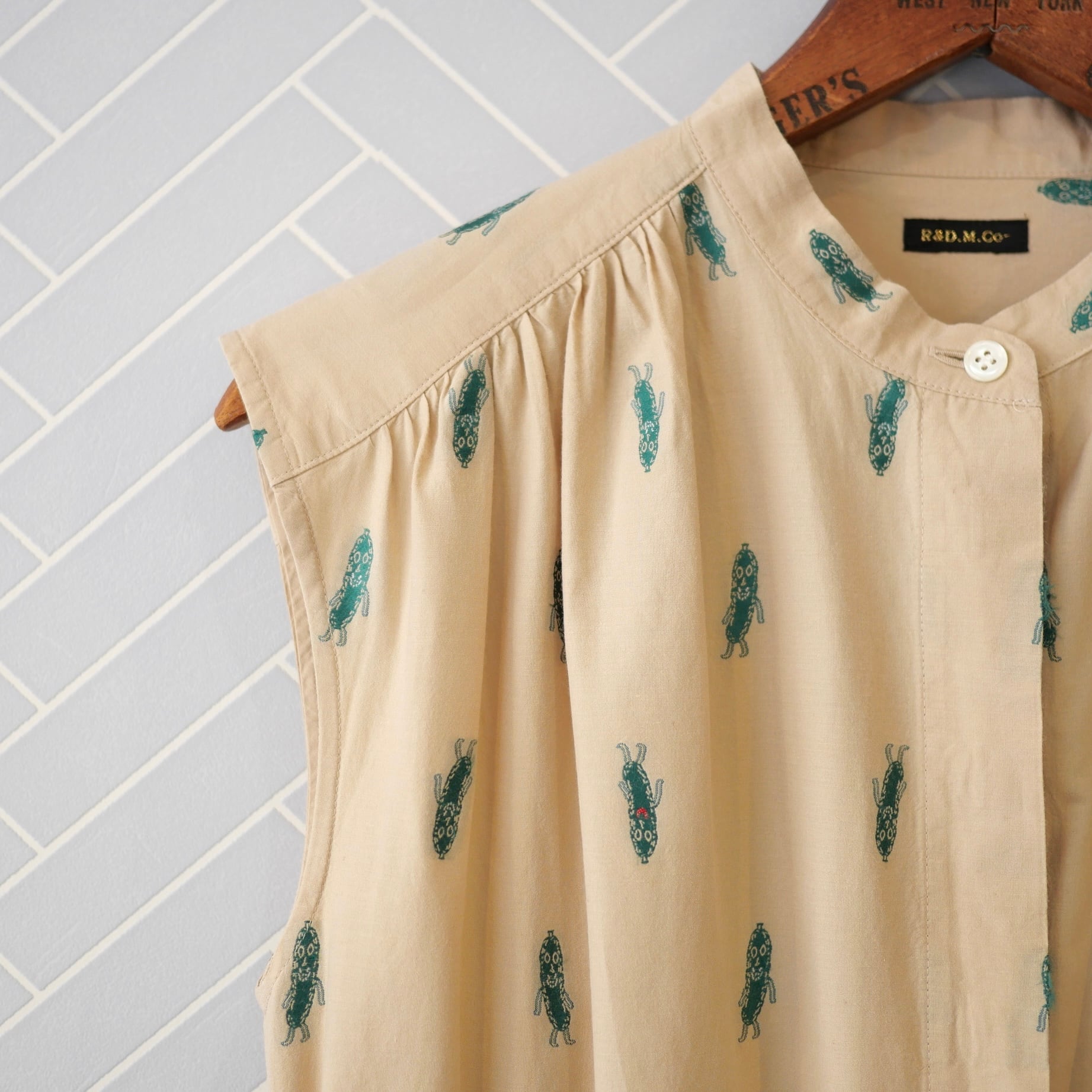 R&D.M.Co- 2023年の限定生地「ジャガードMr.ピックル」のノースリーブワンピース。前あきのワンピースですので、重ね着が楽しい一枚です。コットンの適度な厚みとシルクの滑らかさが特徴的な素材。インナーを変えながら通年お使いいただけます。