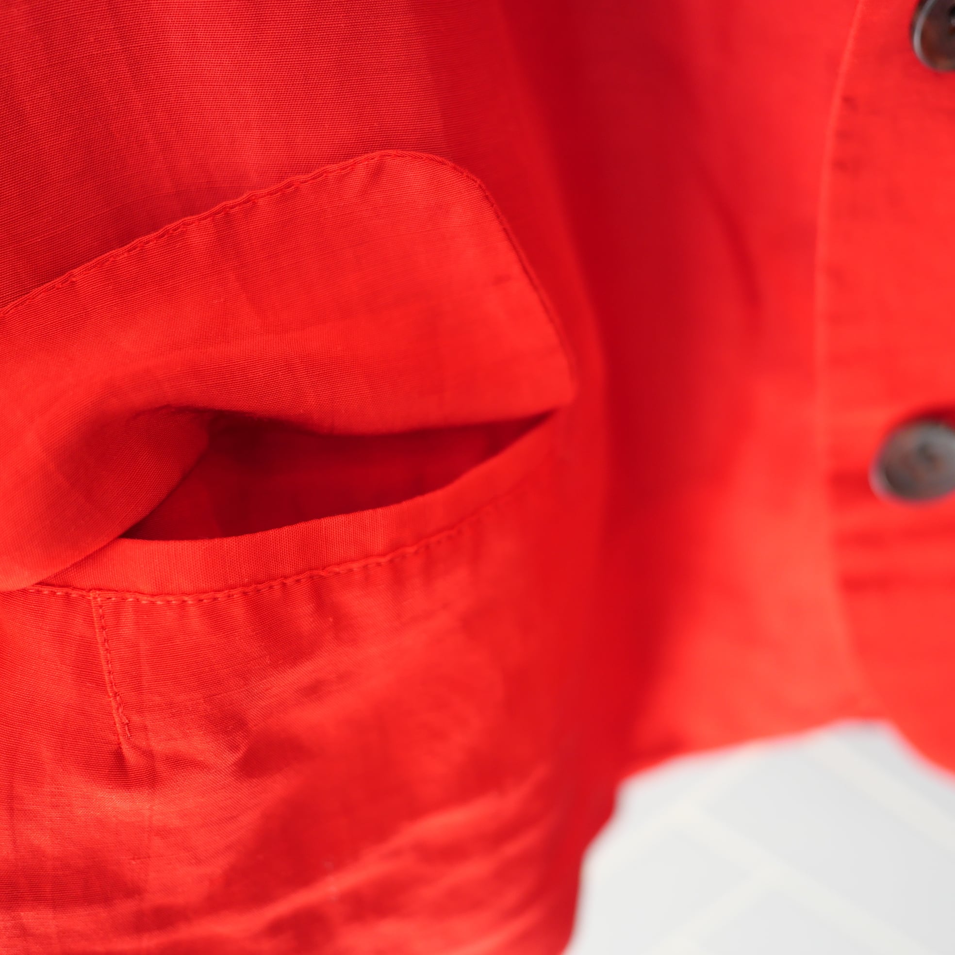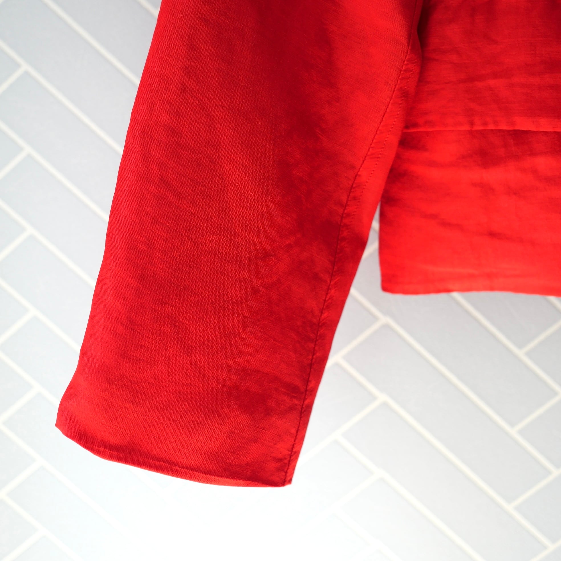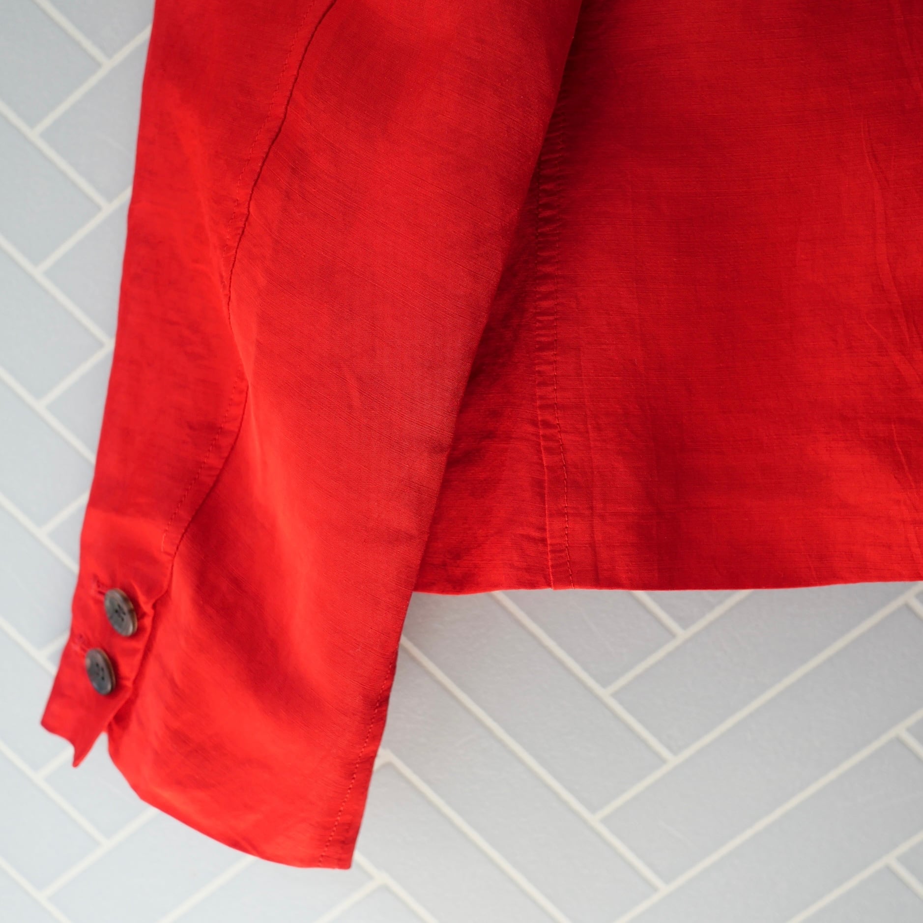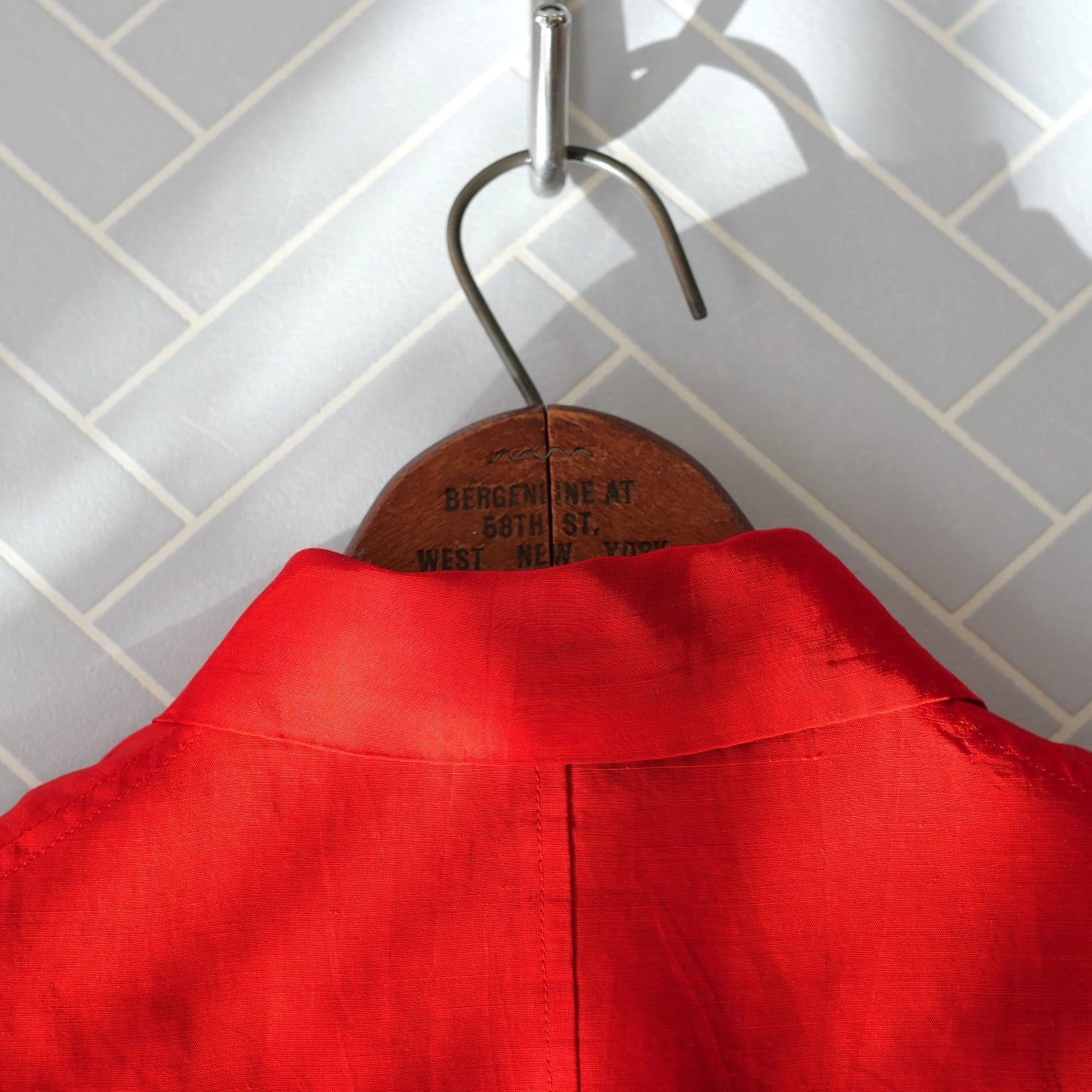 後染めならではの綺麗な赤が目を惹くショートジャケット。ワンピースやサロペットなどと合わせてポイントになるお出かけジャケットです。小さめのサイズなので小柄な方におすすめです。