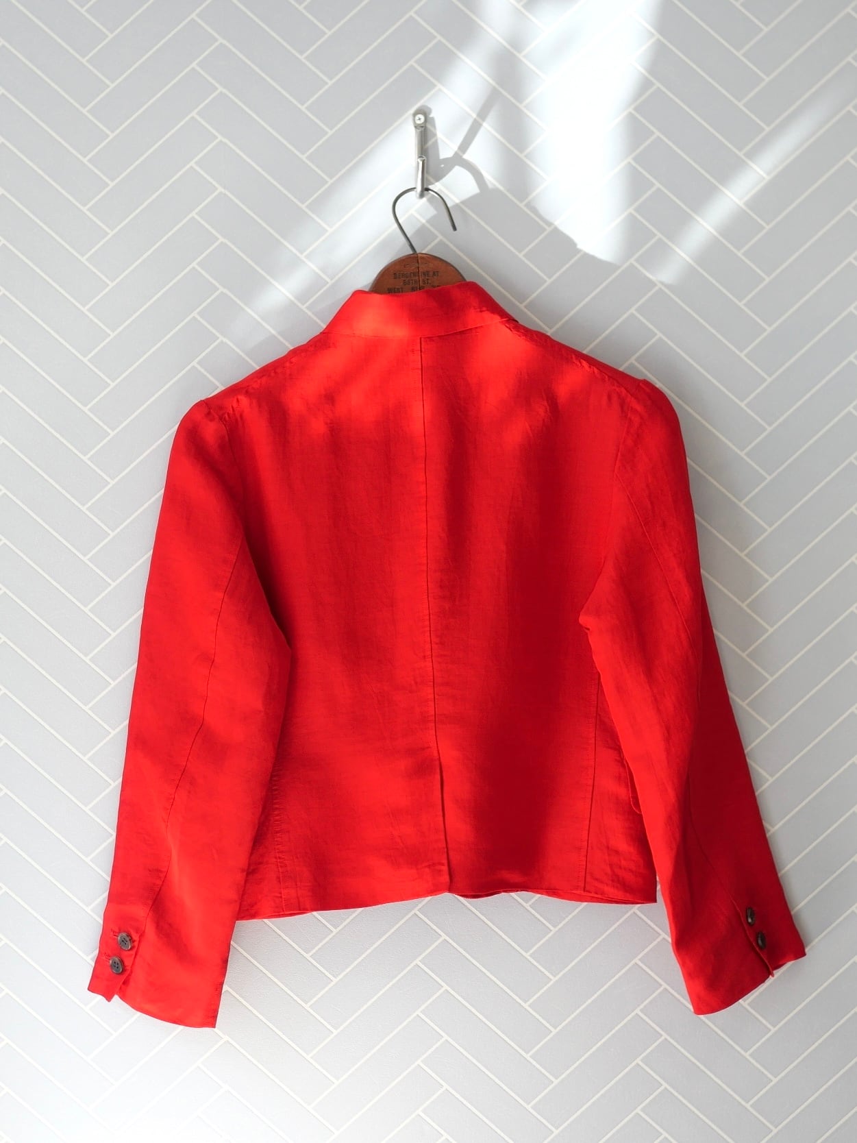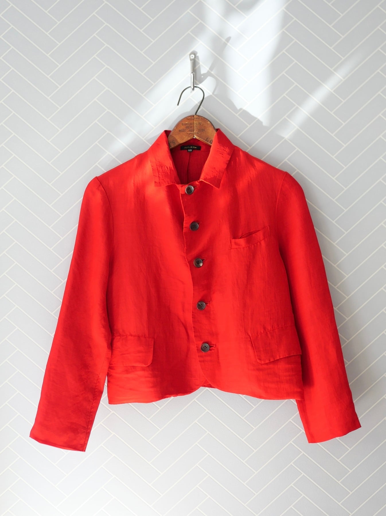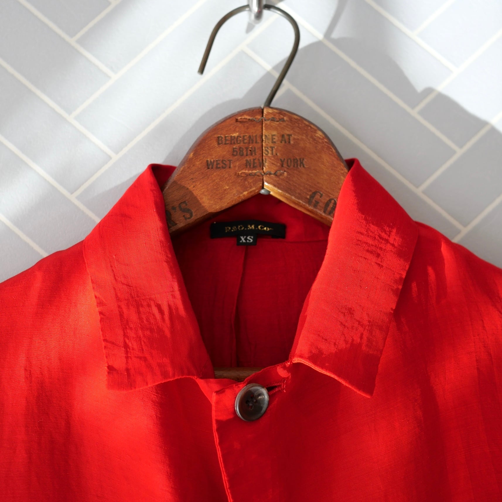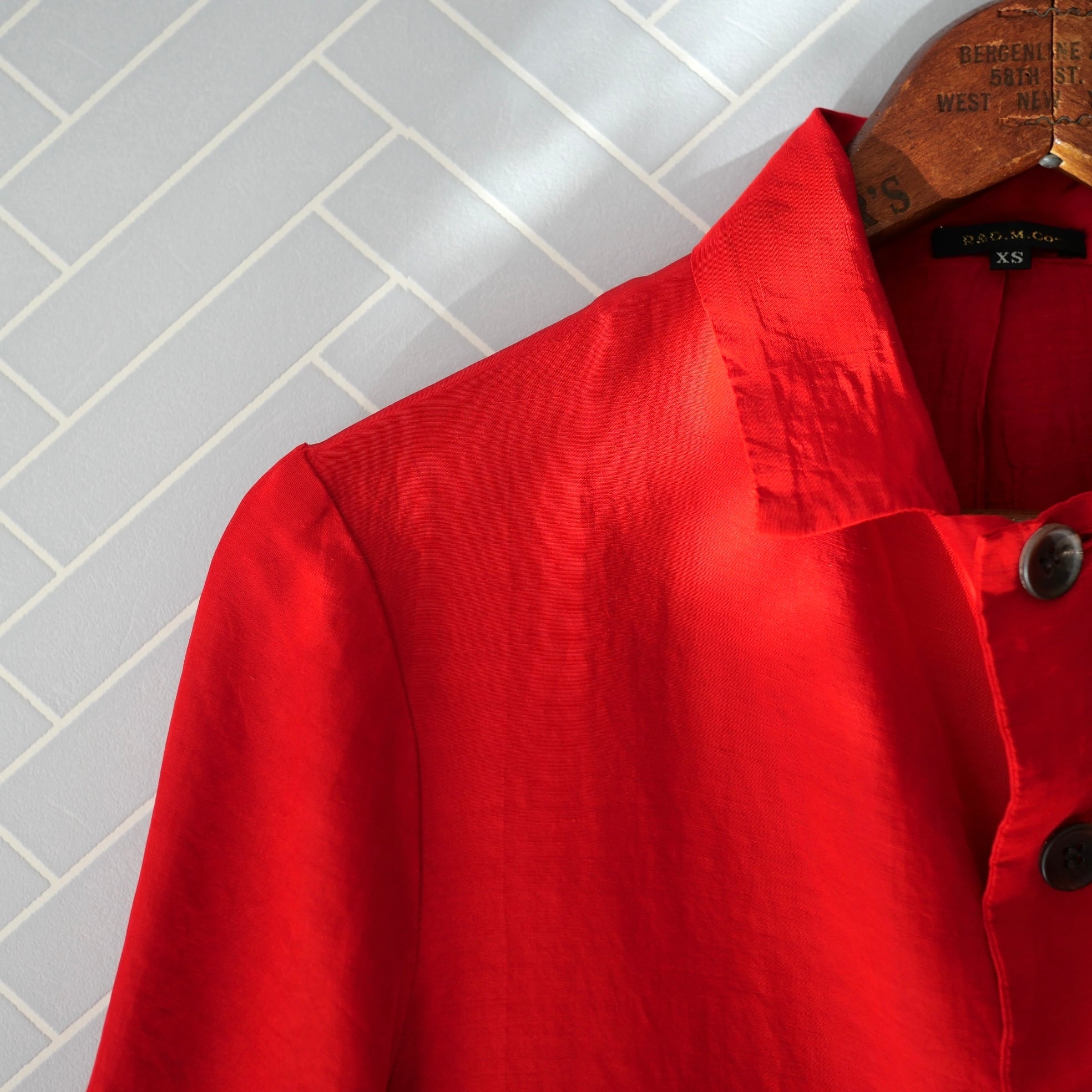 後染めならではの綺麗な赤が目を惹くショートジャケット。ワンピースやサロペットなどと合わせてポイントになるお出かけジャケットです。小さめのサイズなので小柄な方におすすめです。