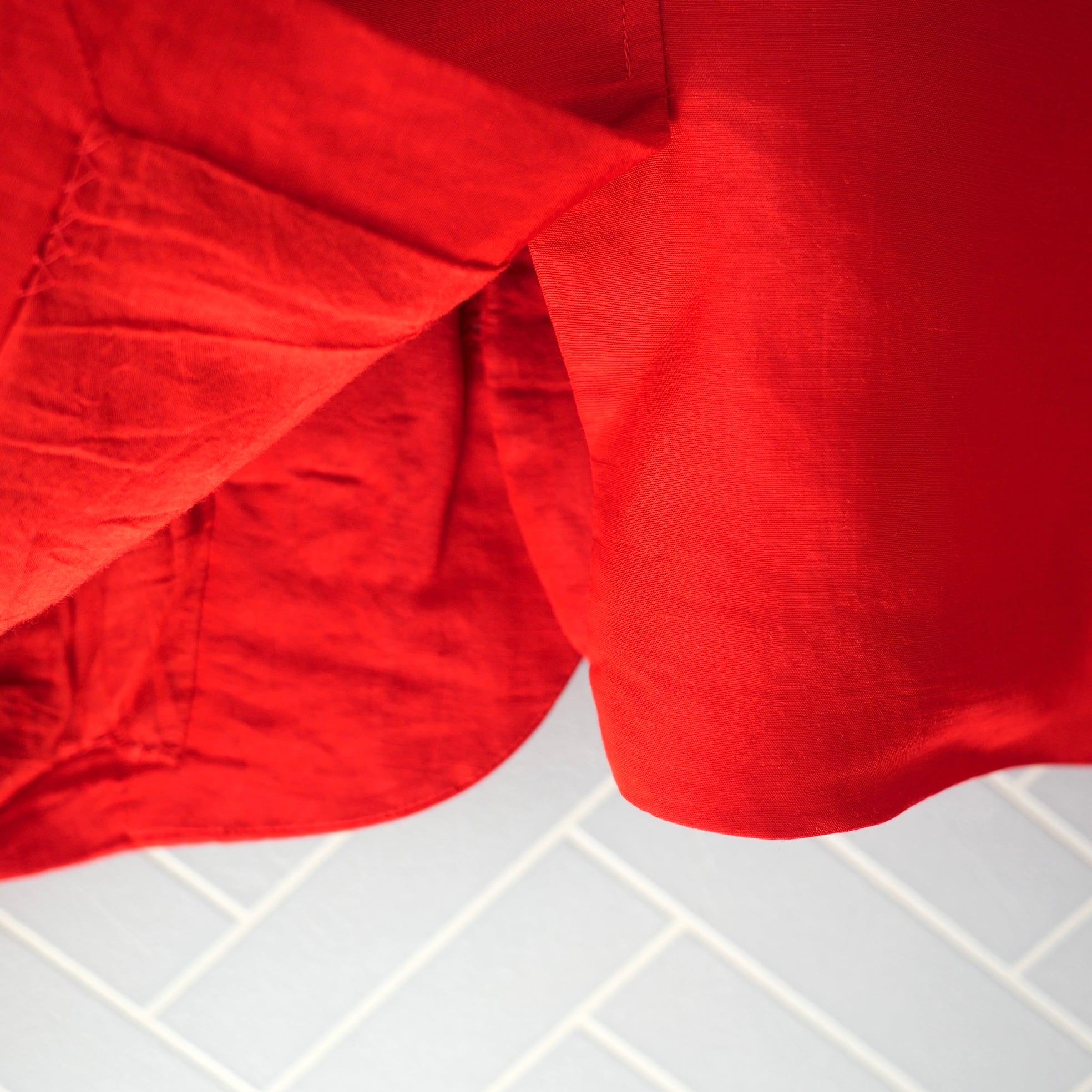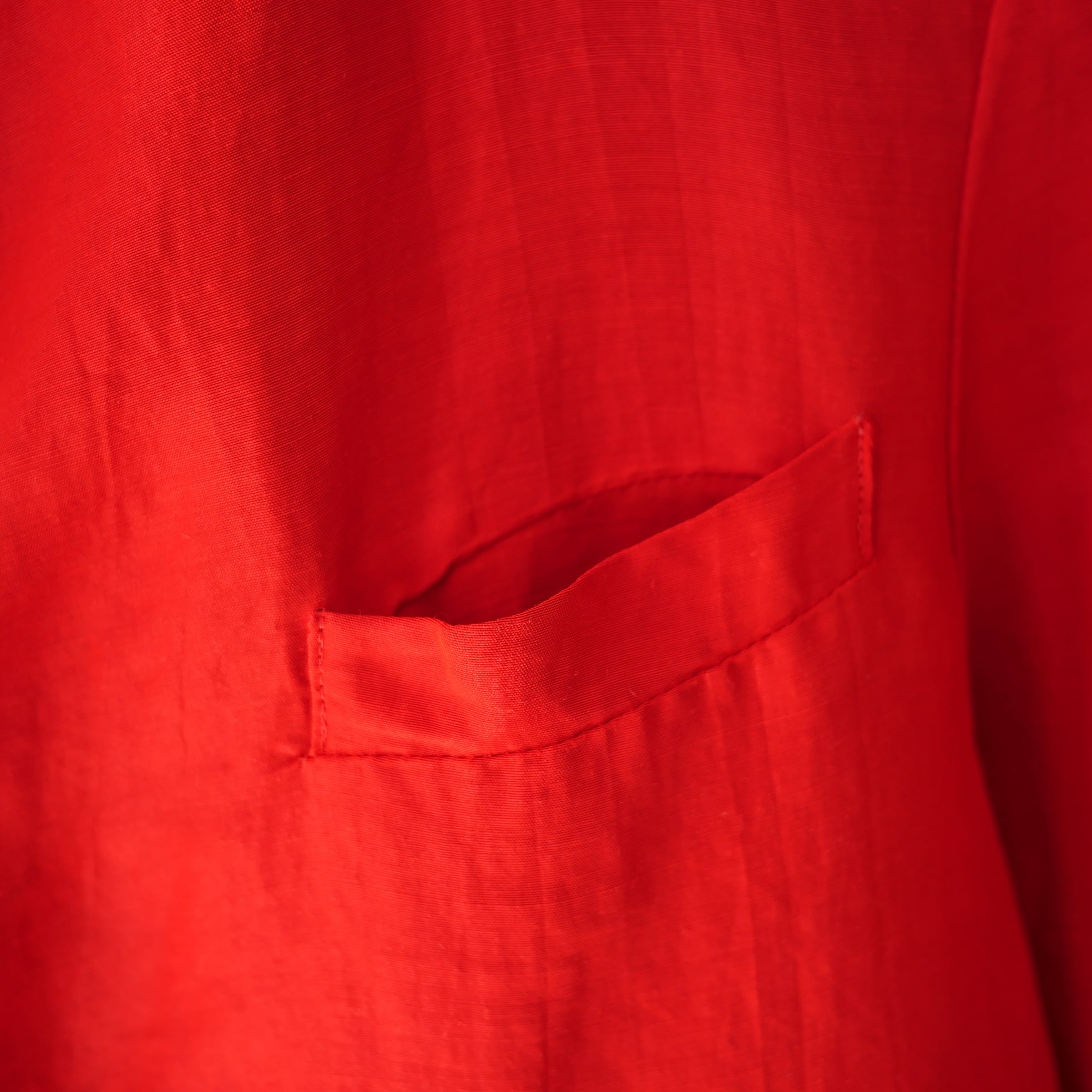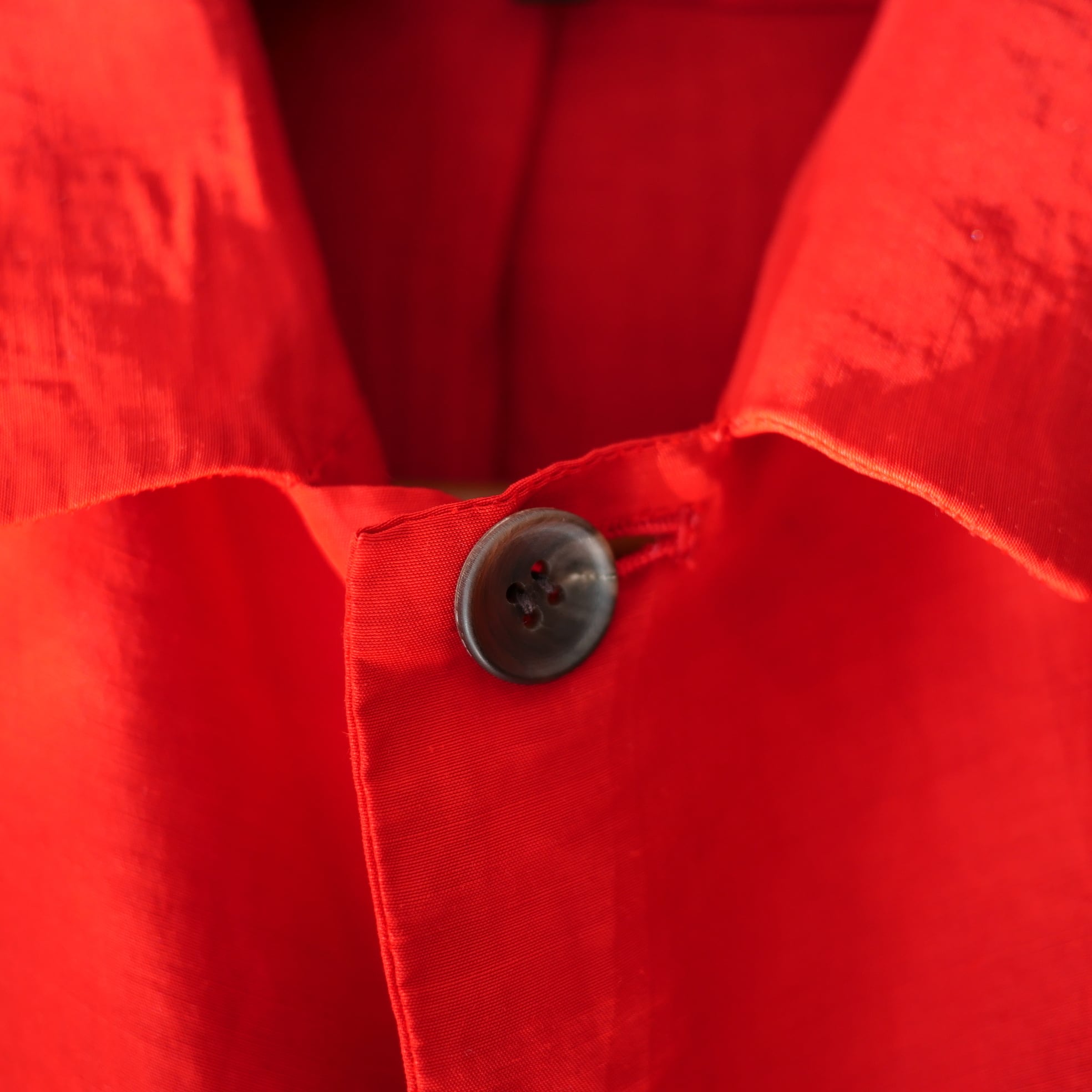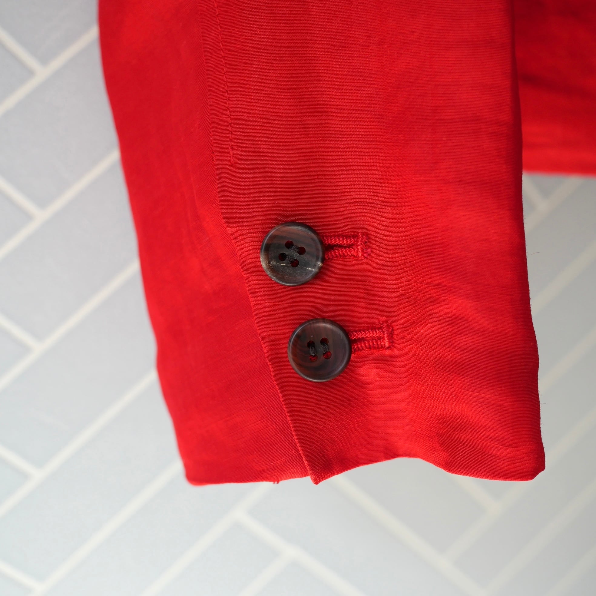 後染めならではの綺麗な赤が目を惹くショートジャケット。ワンピースやサロペットなどと合わせてポイントになるお出かけジャケットです。小さめのサイズなので小柄な方におすすめです。