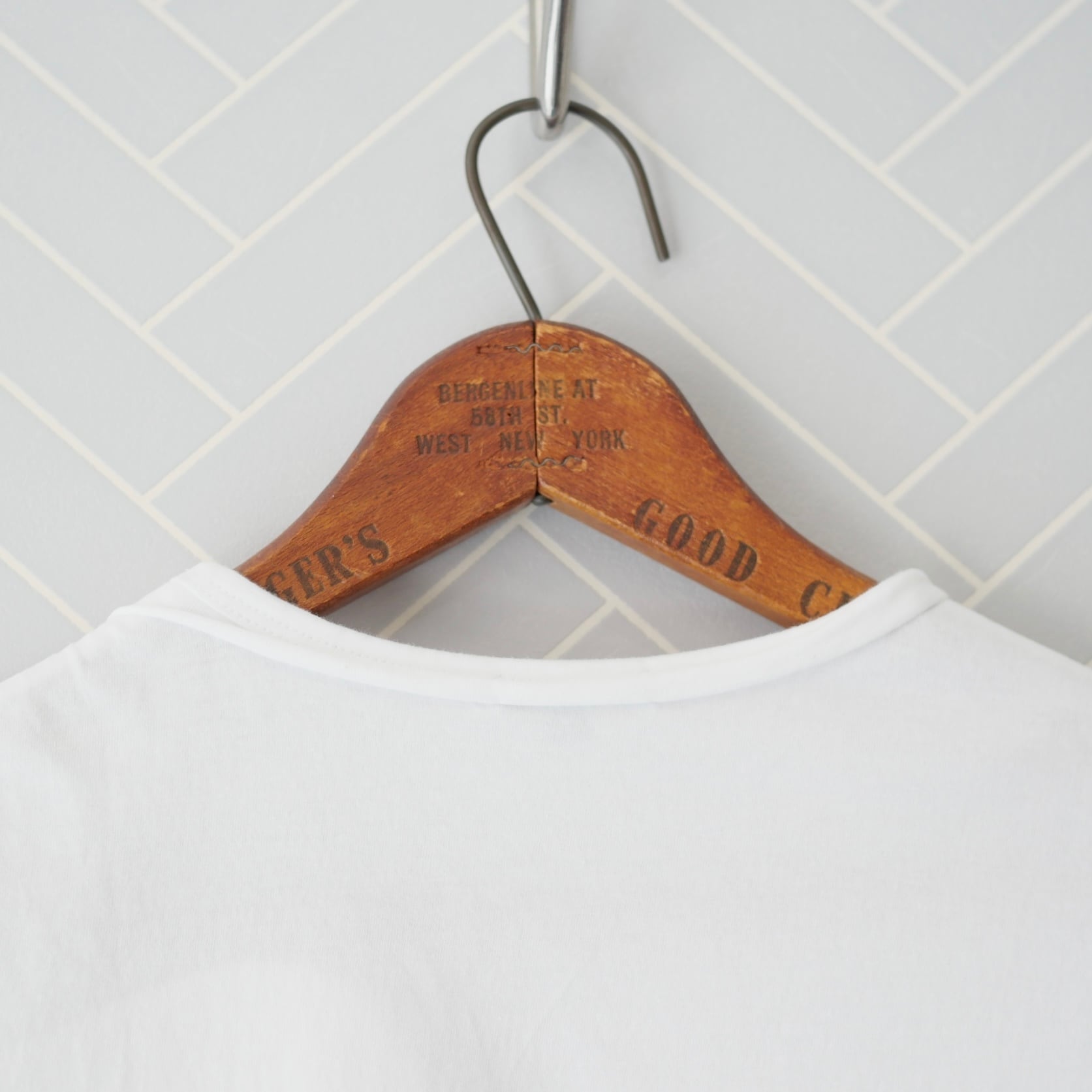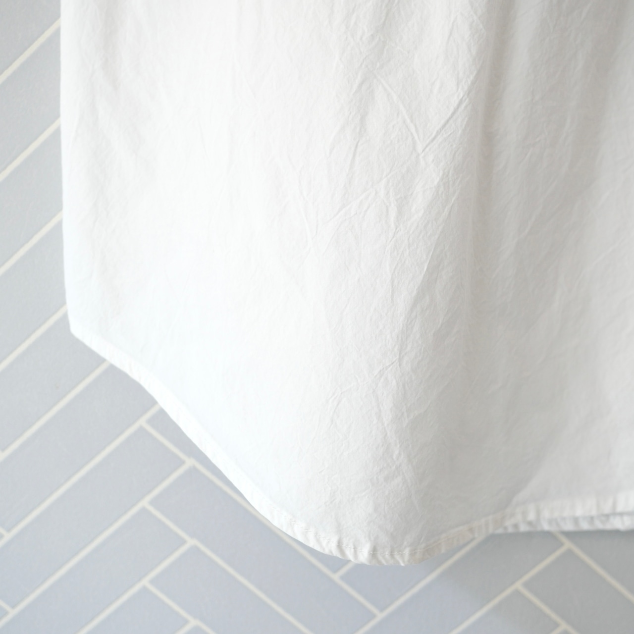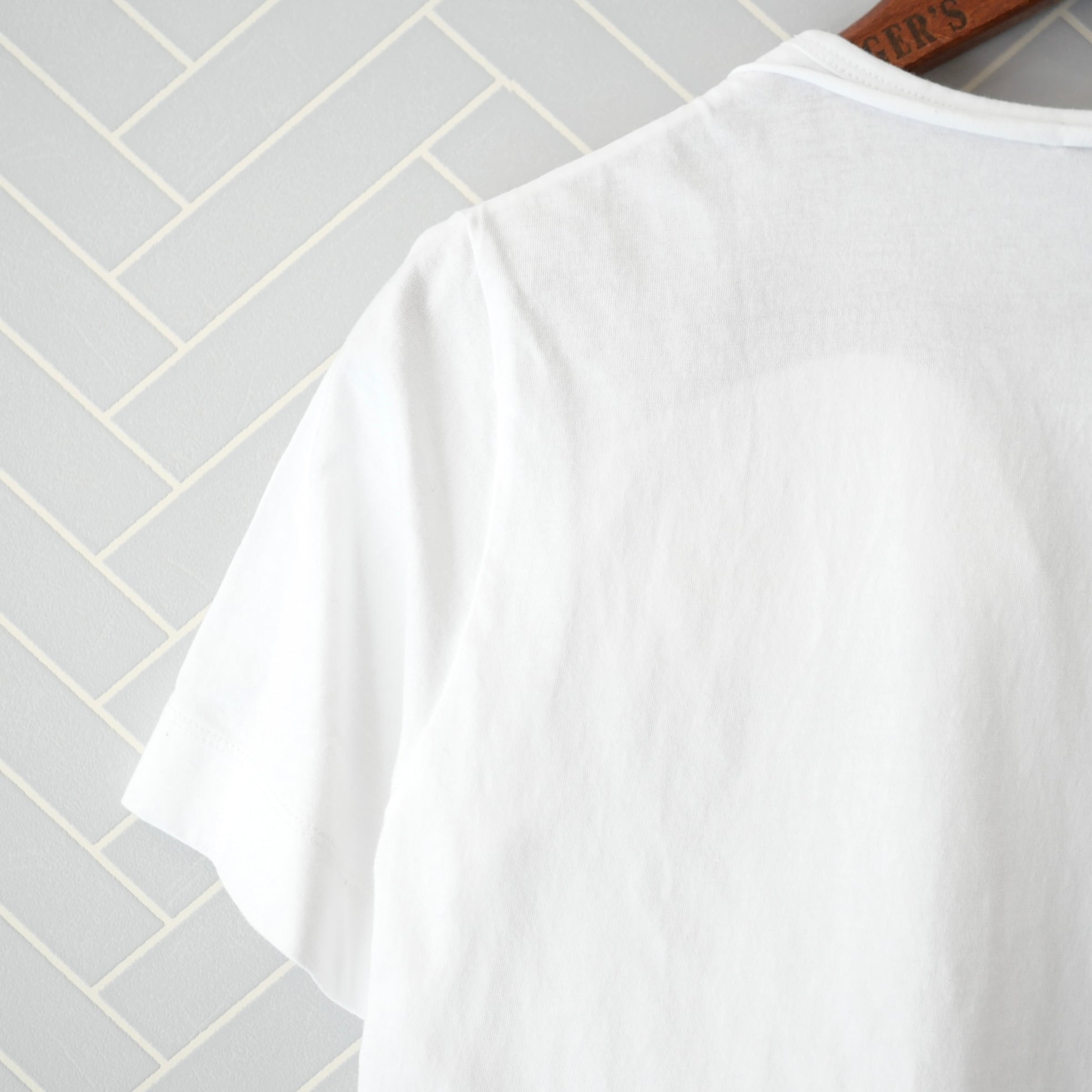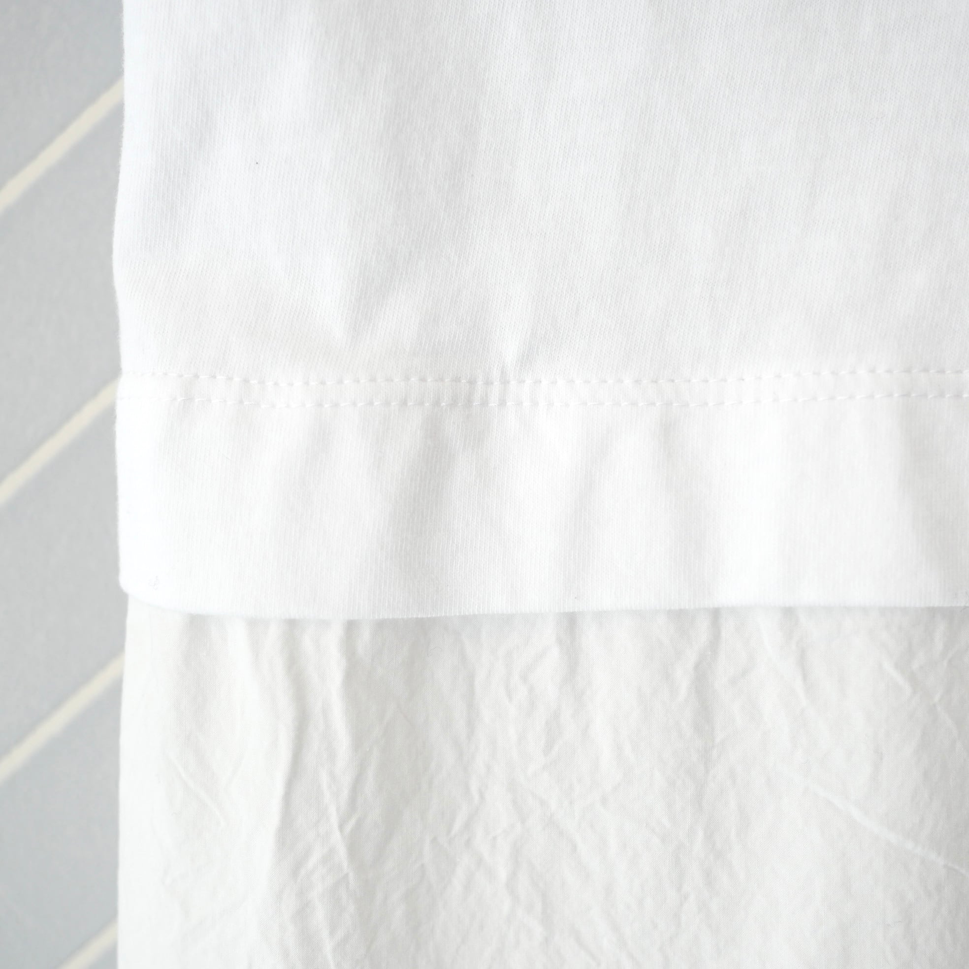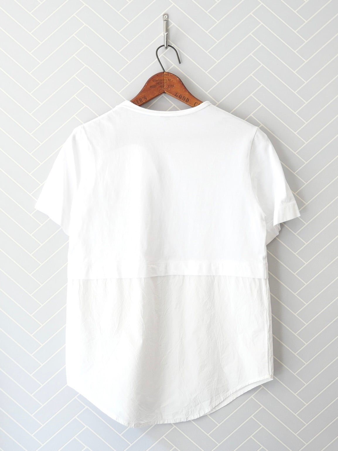 R&D.M.Co- シャツテイルTシャツ。一見シンプルなクルーネックTシャツに見えますが、下半分はシャツ生地を使った個性ある一枚です。カジュアルすぎず、キレイめな着回しにもおすすめです。