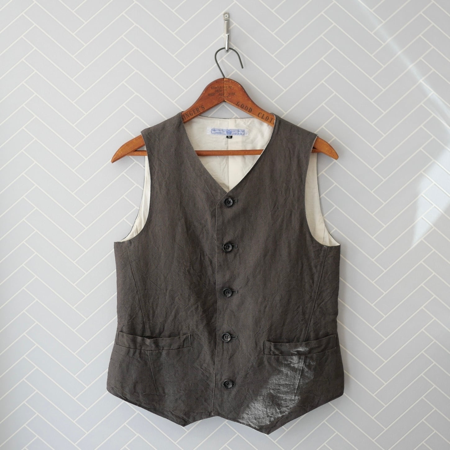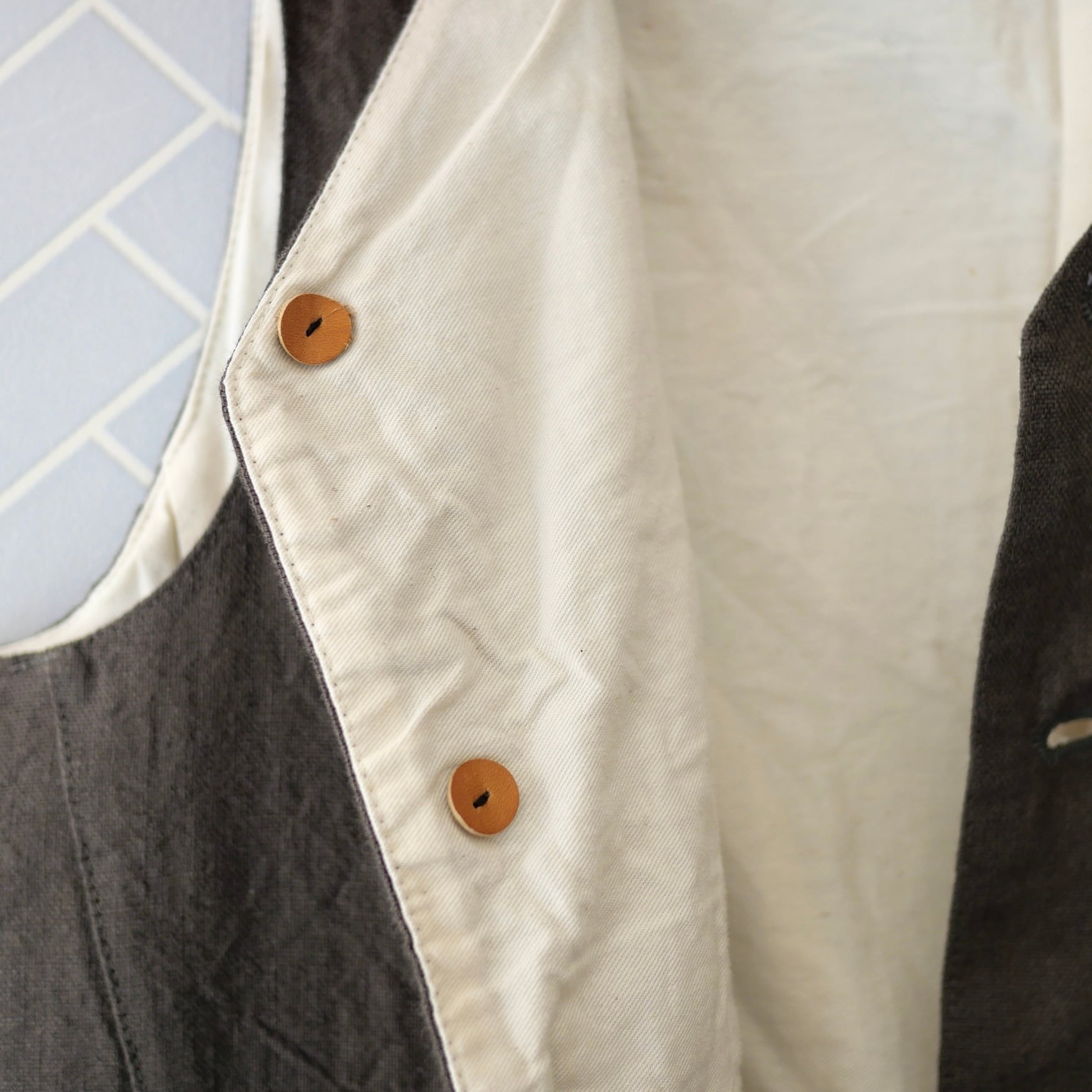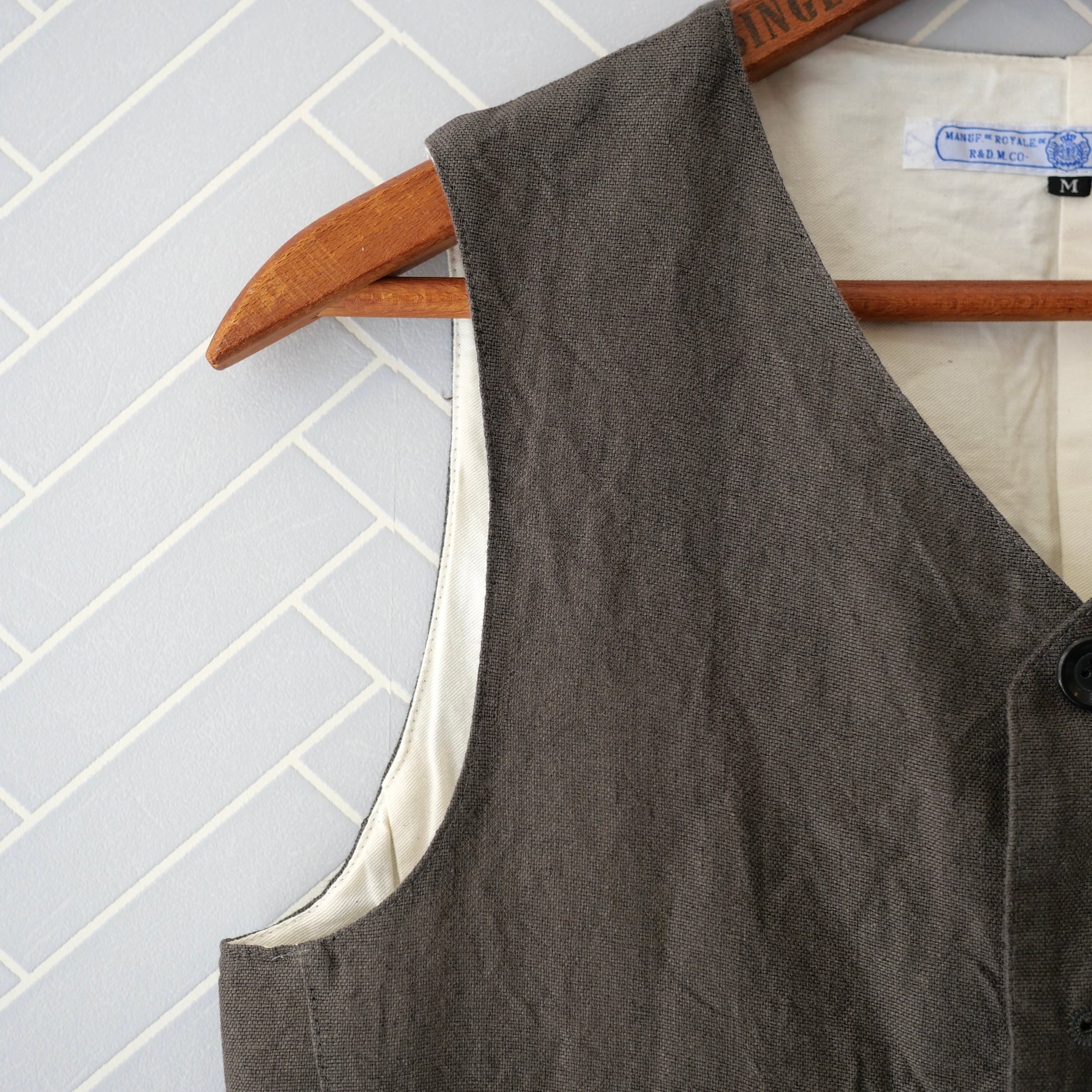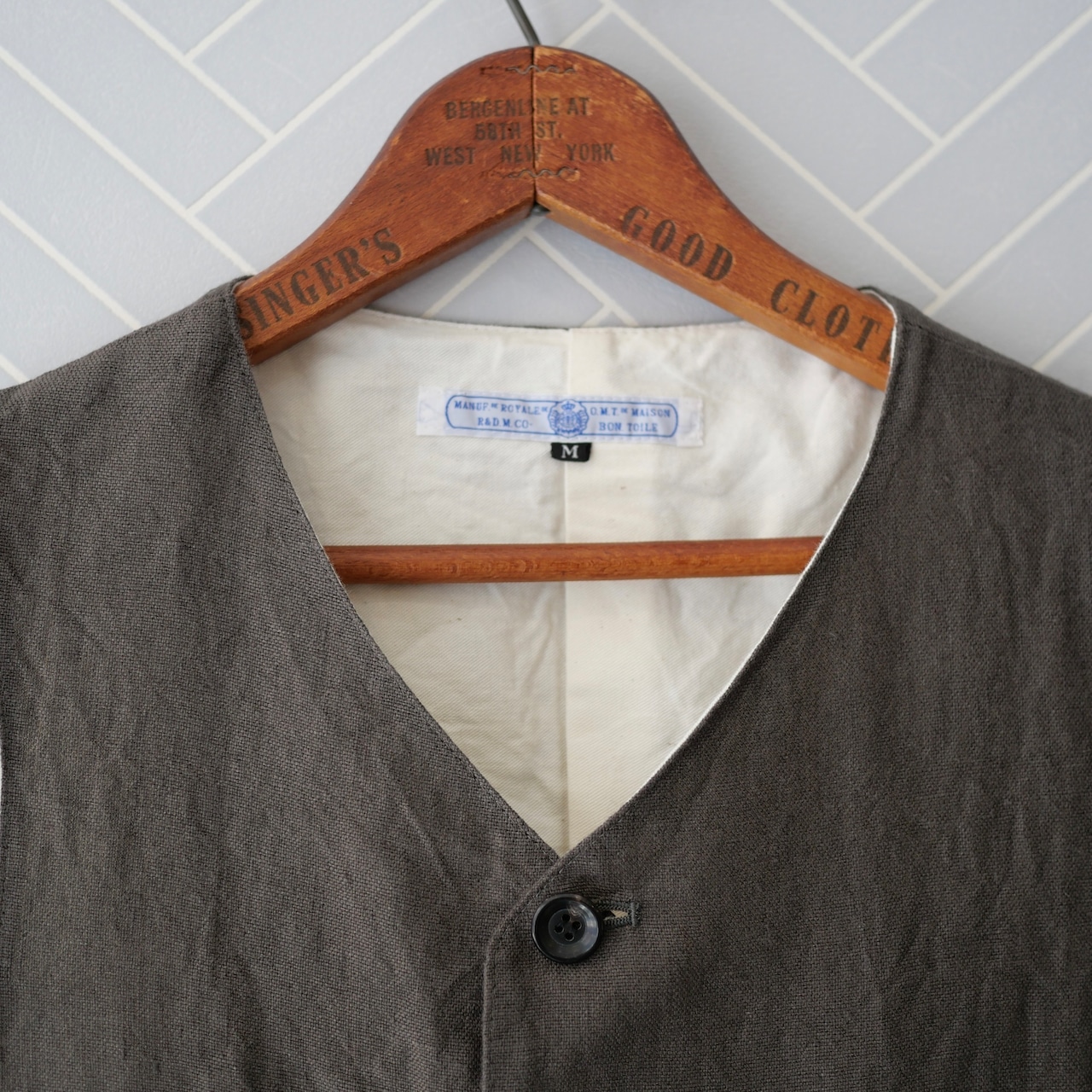 R&D.M.Co- ブランドを代表するようなブリティッシュデザインのリネンベスト。やや厚みのあるリネンは、自然なシワ感があり、古き良き英国スタイルを思わせる質感です。コットンの裏地や、レザーのチカラボタン、後ろ見頃のベルトも素敵なアイテムです。
