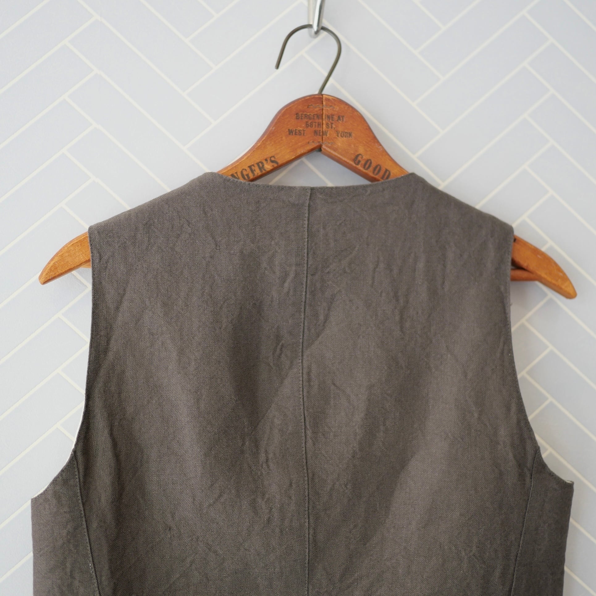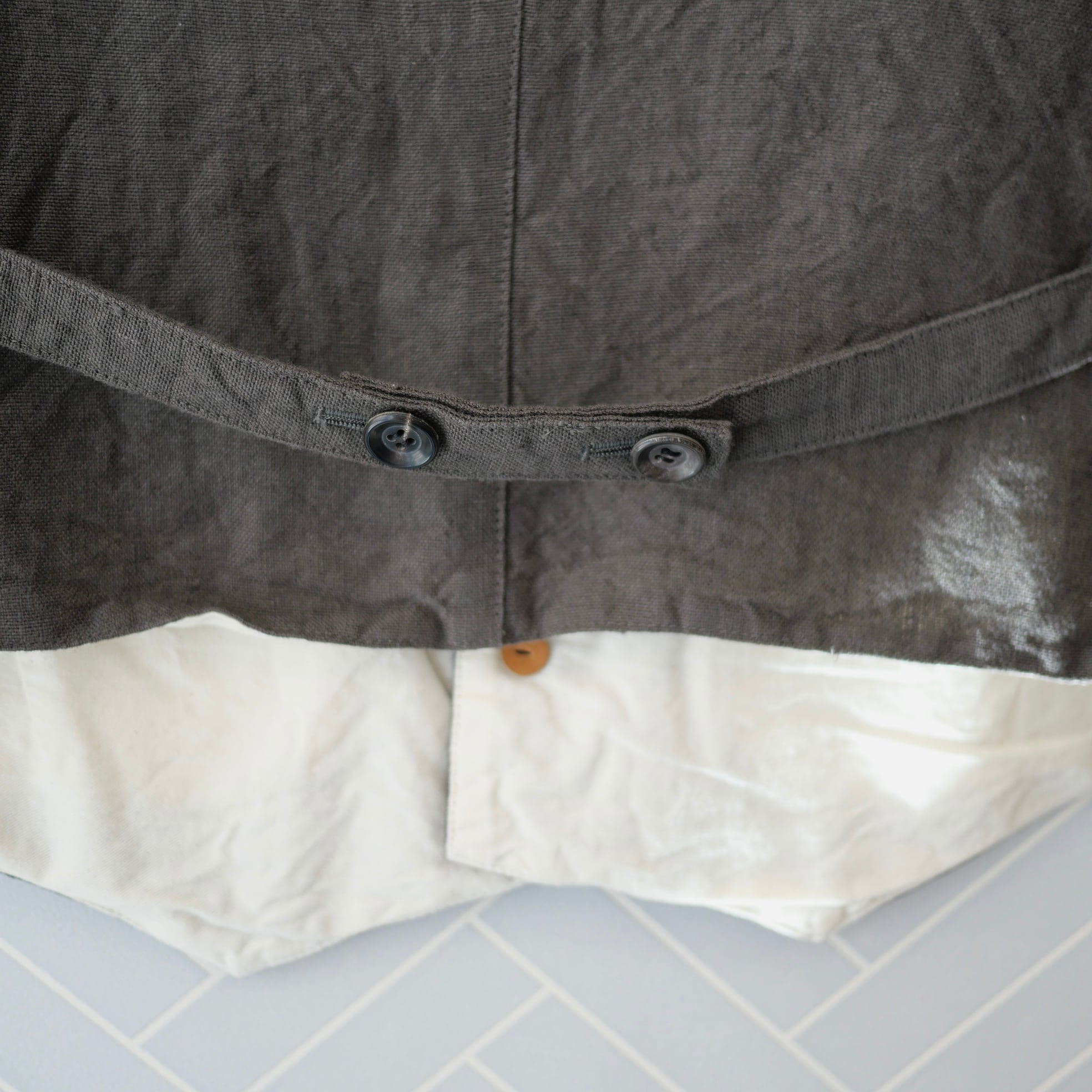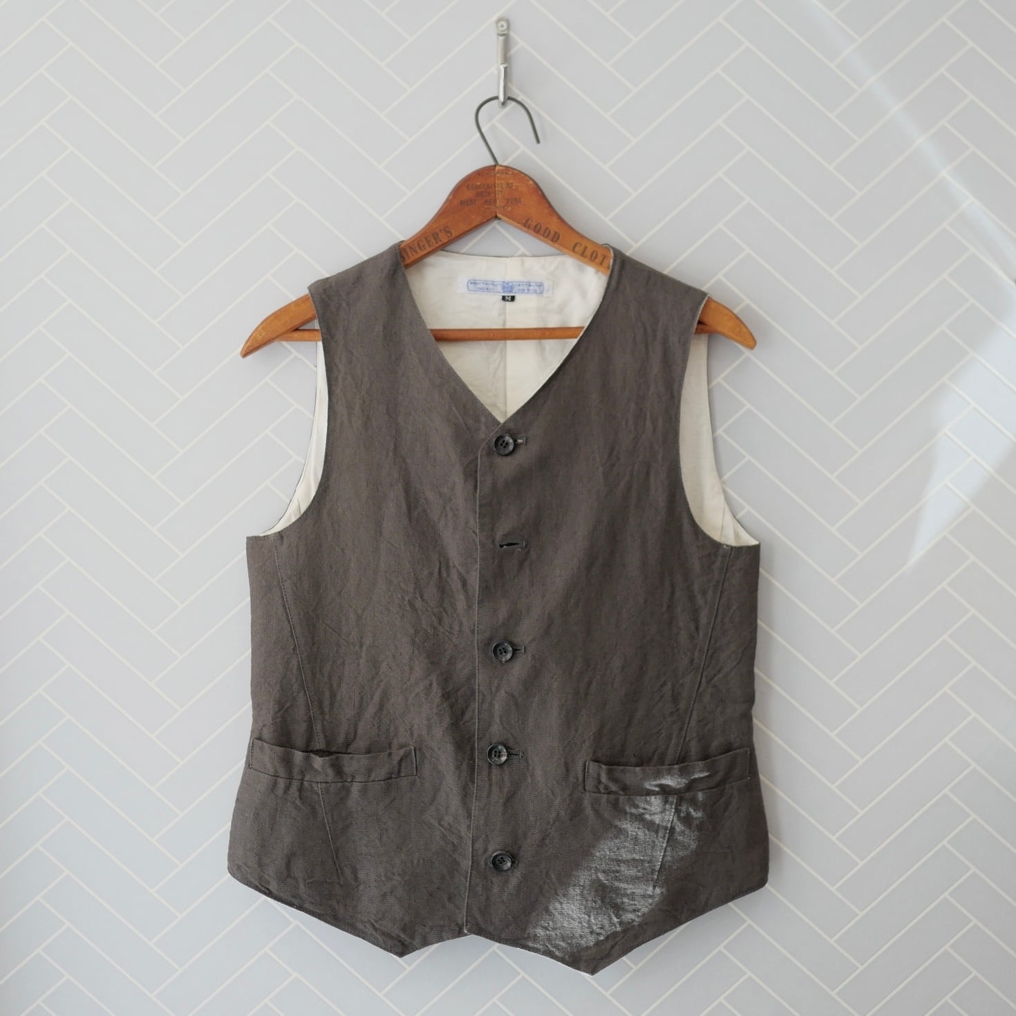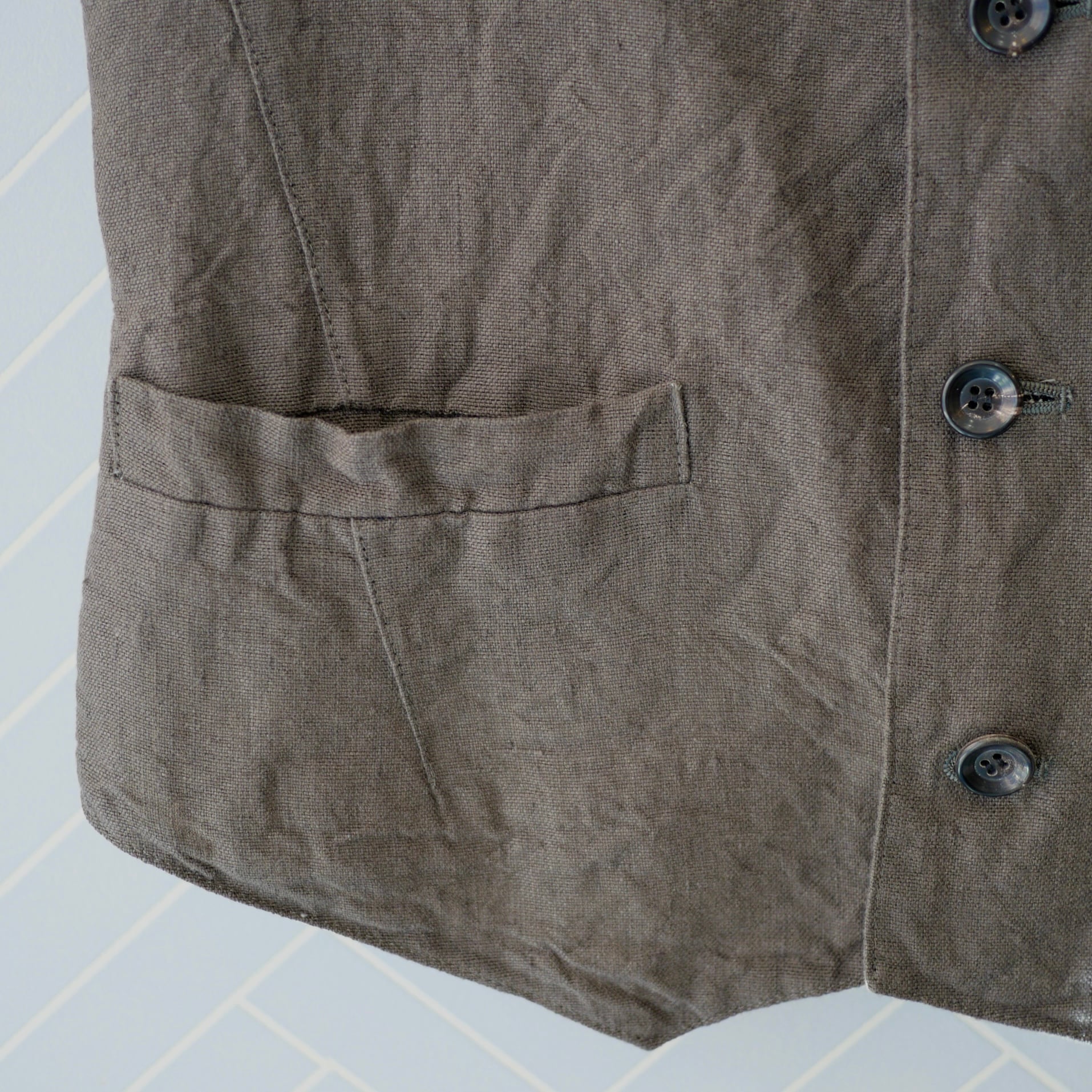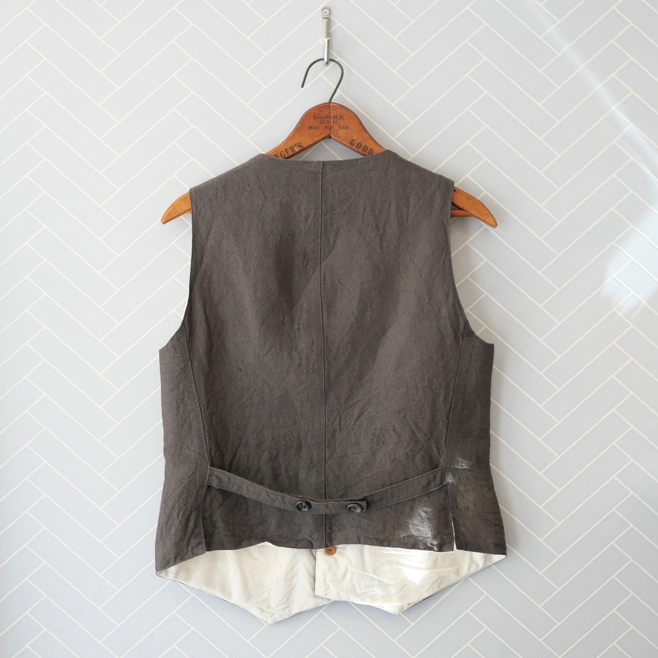 R&D.M.Co- ブランドを代表するようなブリティッシュデザインのリネンベスト。やや厚みのあるリネンは、自然なシワ感があり、古き良き英国スタイルを思わせる質感です。コットンの裏地や、レザーのチカラボタン、後ろ見頃のベルトも素敵なアイテムです。