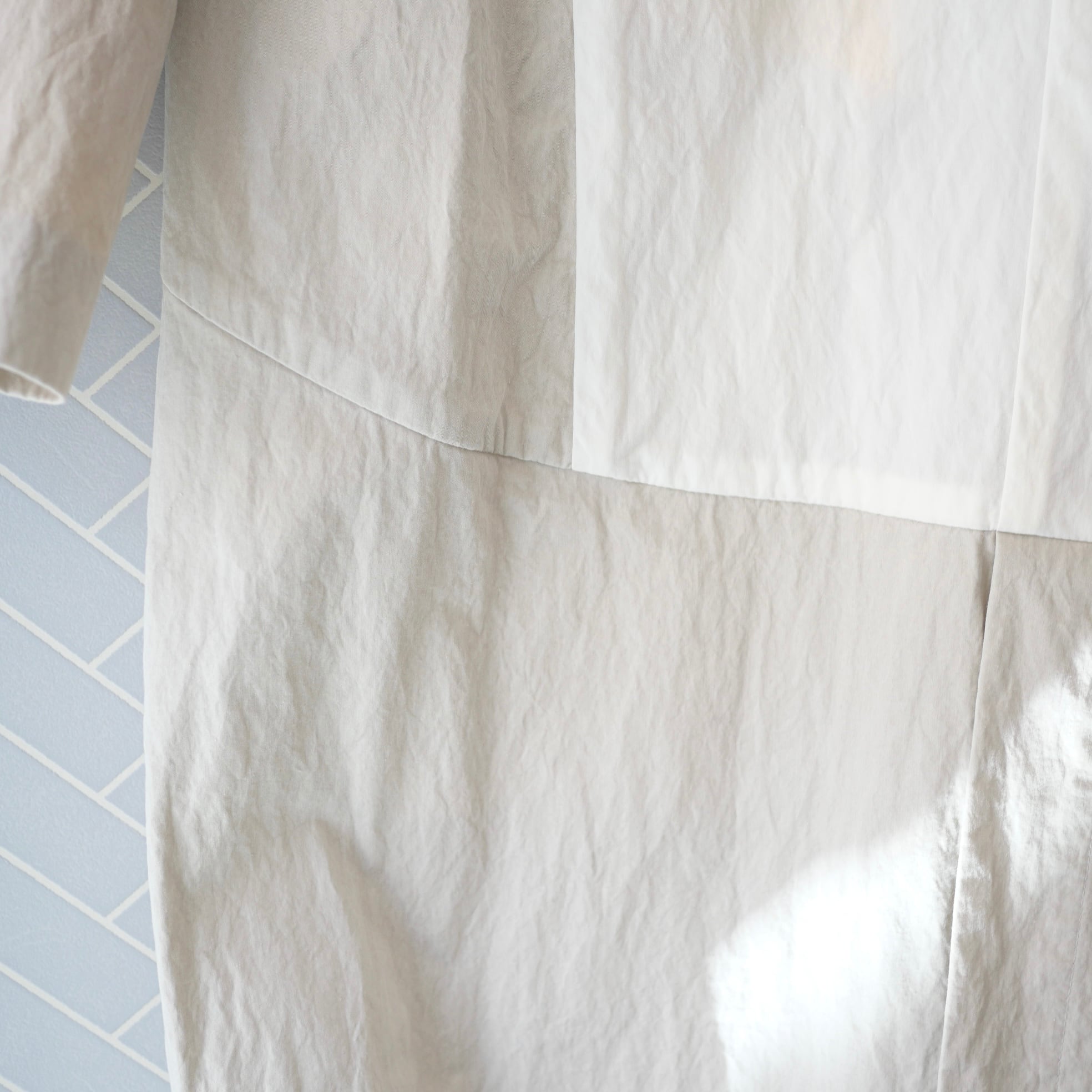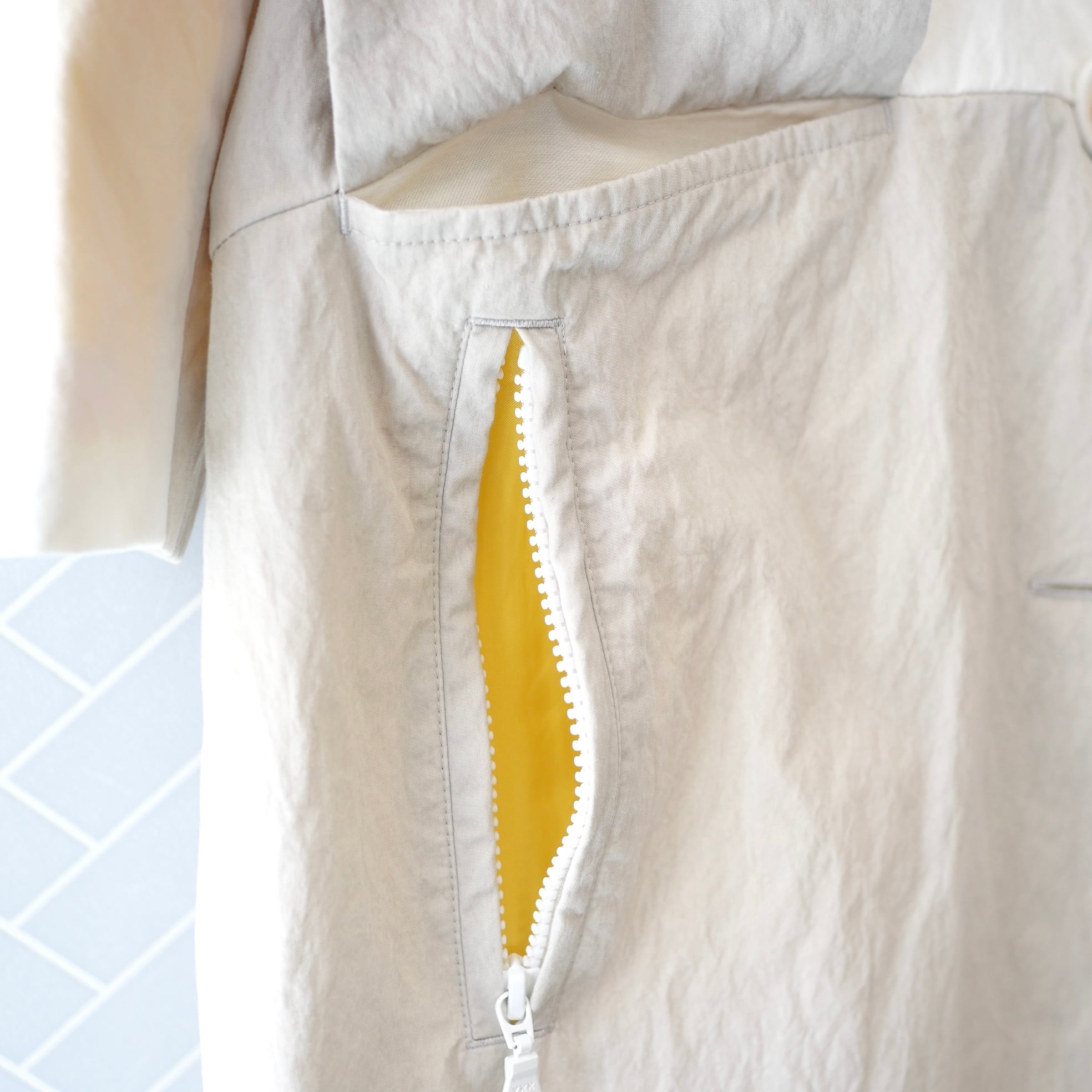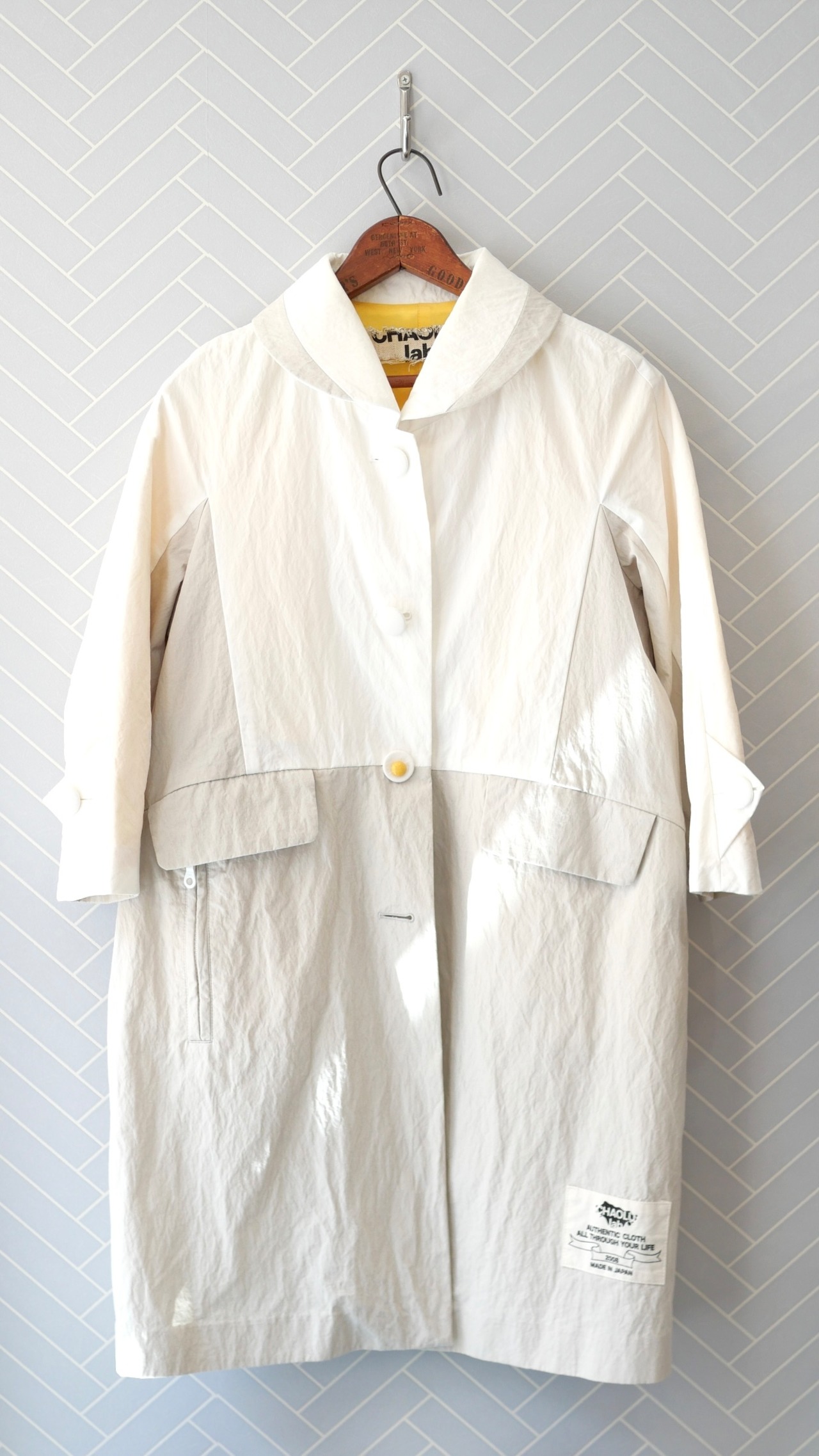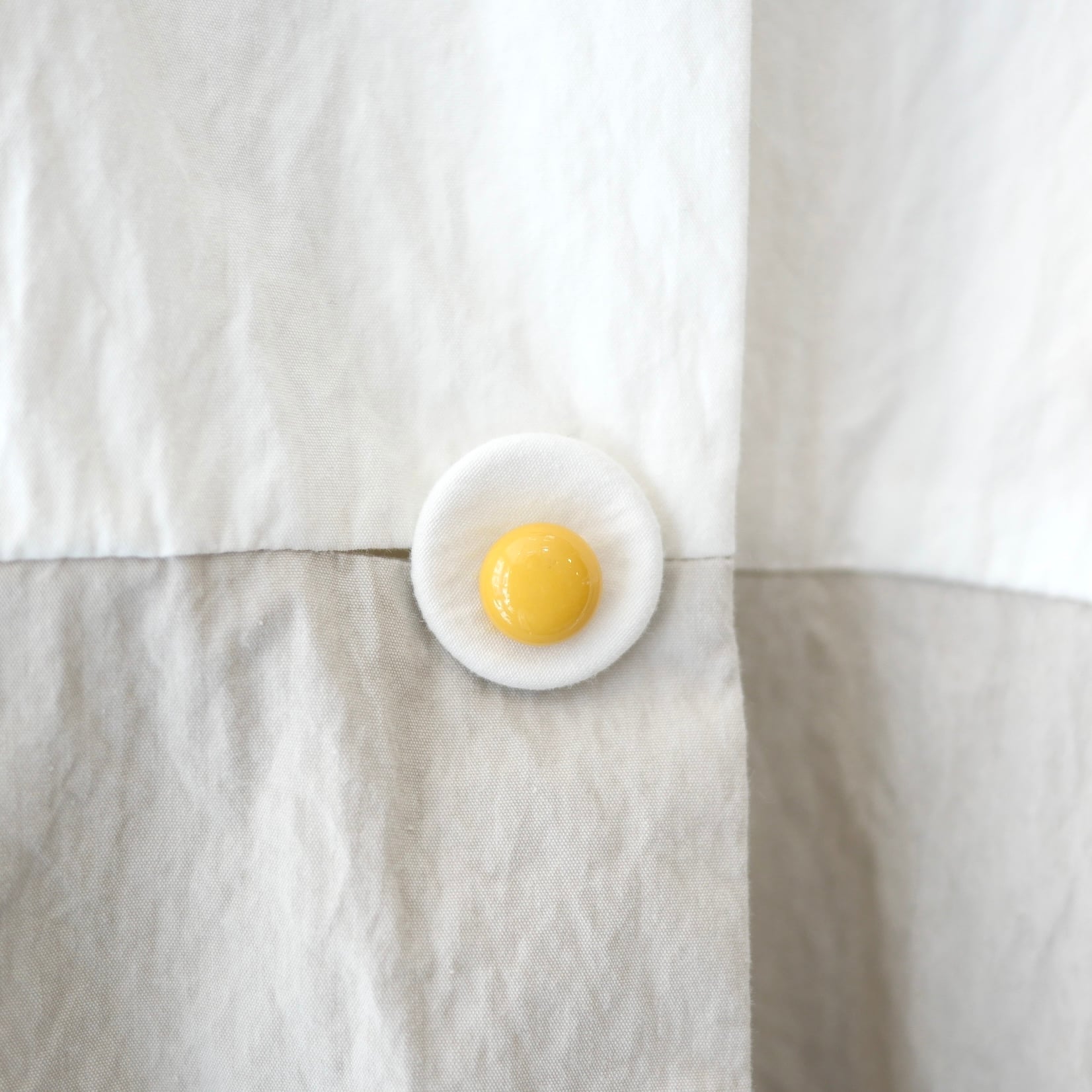 コットンナイロン素材の春コート。個性的なカットとモチーフがかわいい遊び心のある一枚です。表示タグに劣化がありますが、服の状態は大変綺麗なリユース品です。ホワイトとグレーの配色、卵のボタンと裏地のイエローが特徴的です。