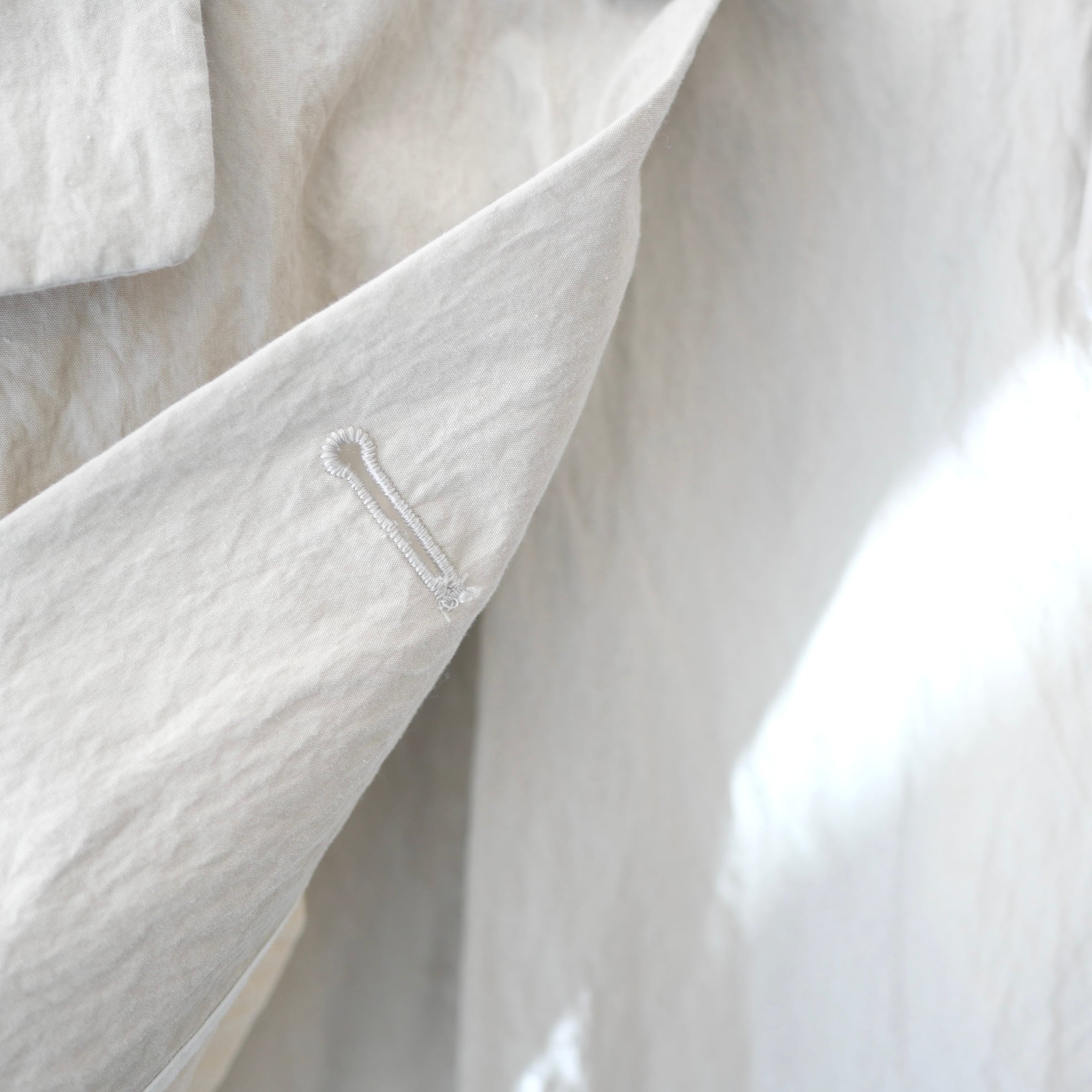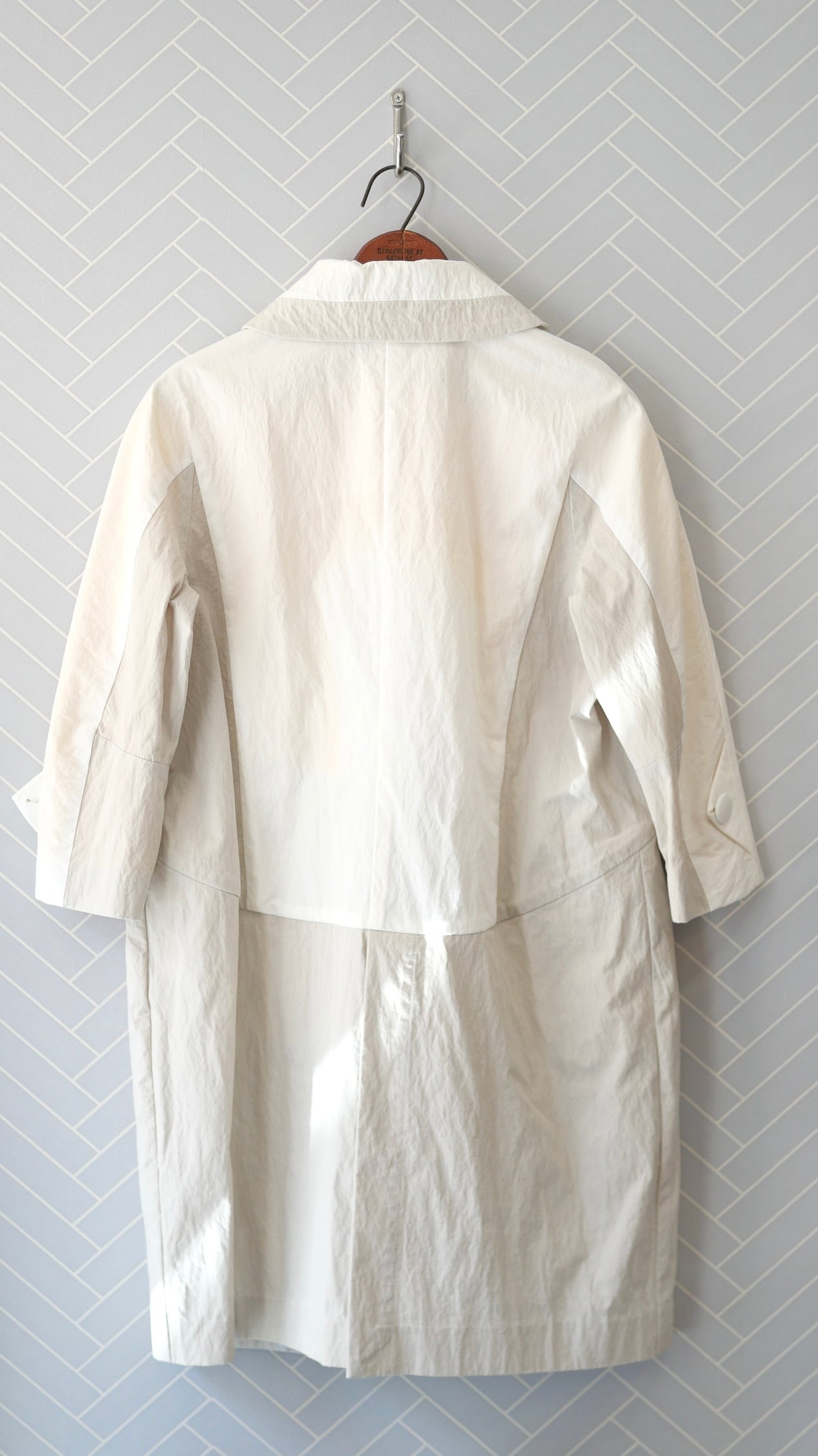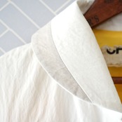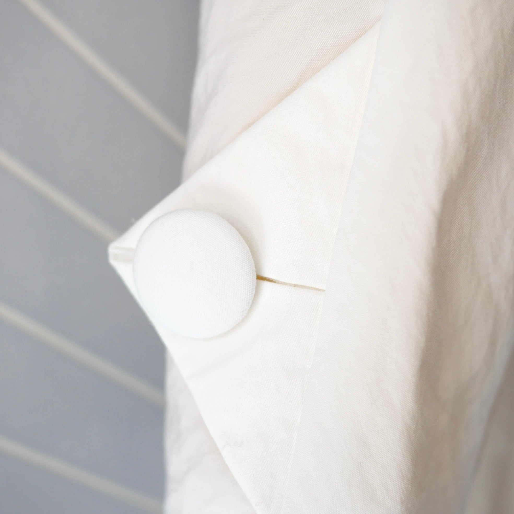 コットンナイロン素材の春コート。個性的なカットとモチーフがかわいい遊び心のある一枚です。表示タグに劣化がありますが、服の状態は大変綺麗なリユース品です。ホワイトとグレーの配色、卵のボタンと裏地のイエローが特徴的です。