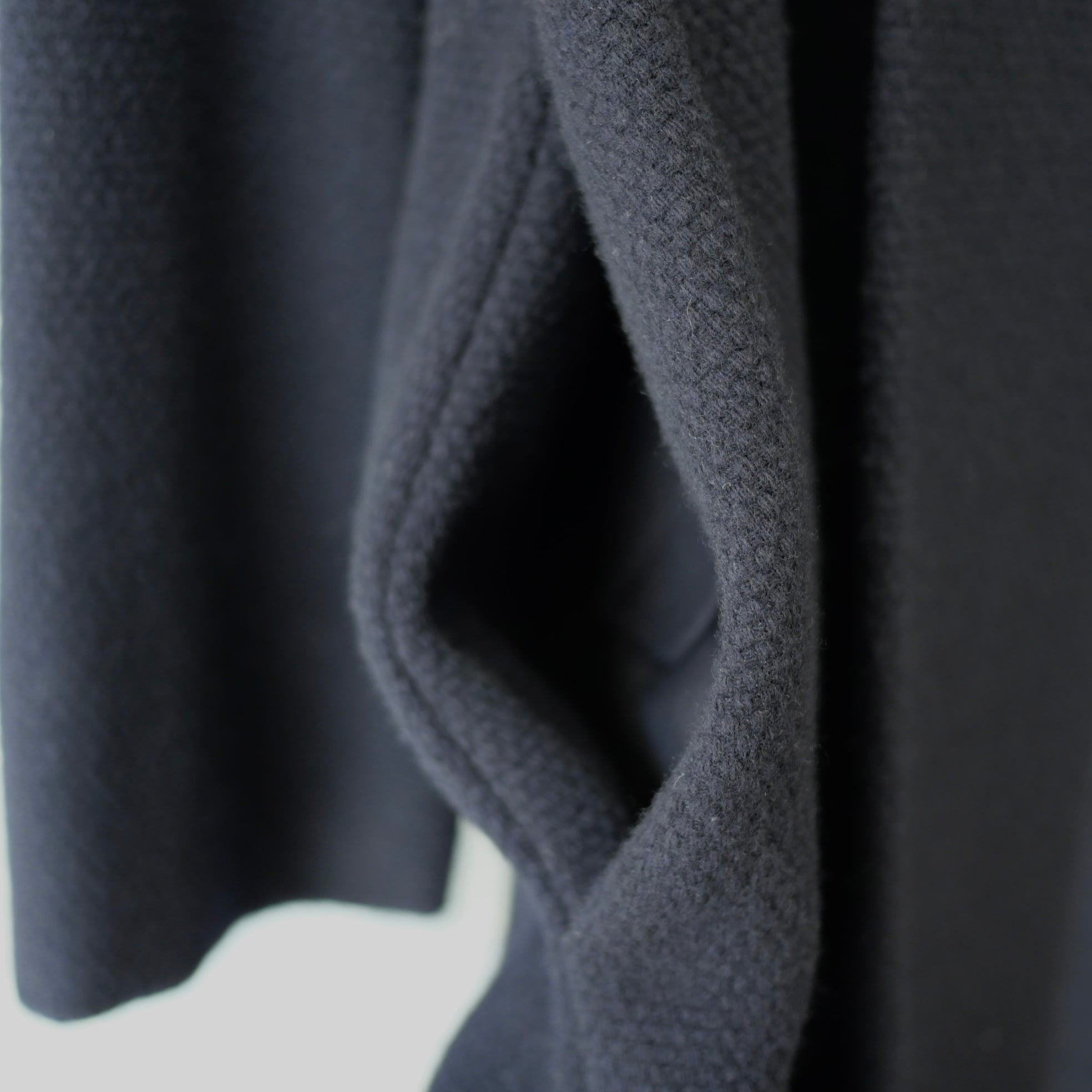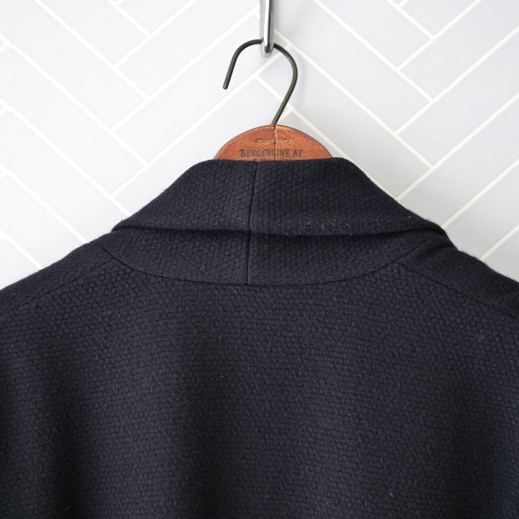 evam eva 人気のウールコート。ショールカラータイプが大変綺麗な状態で入荷しました。濃紺のロングコートはシーンを選ばず活躍します。裏地が付いていて形崩れしない丈夫なアウターです。